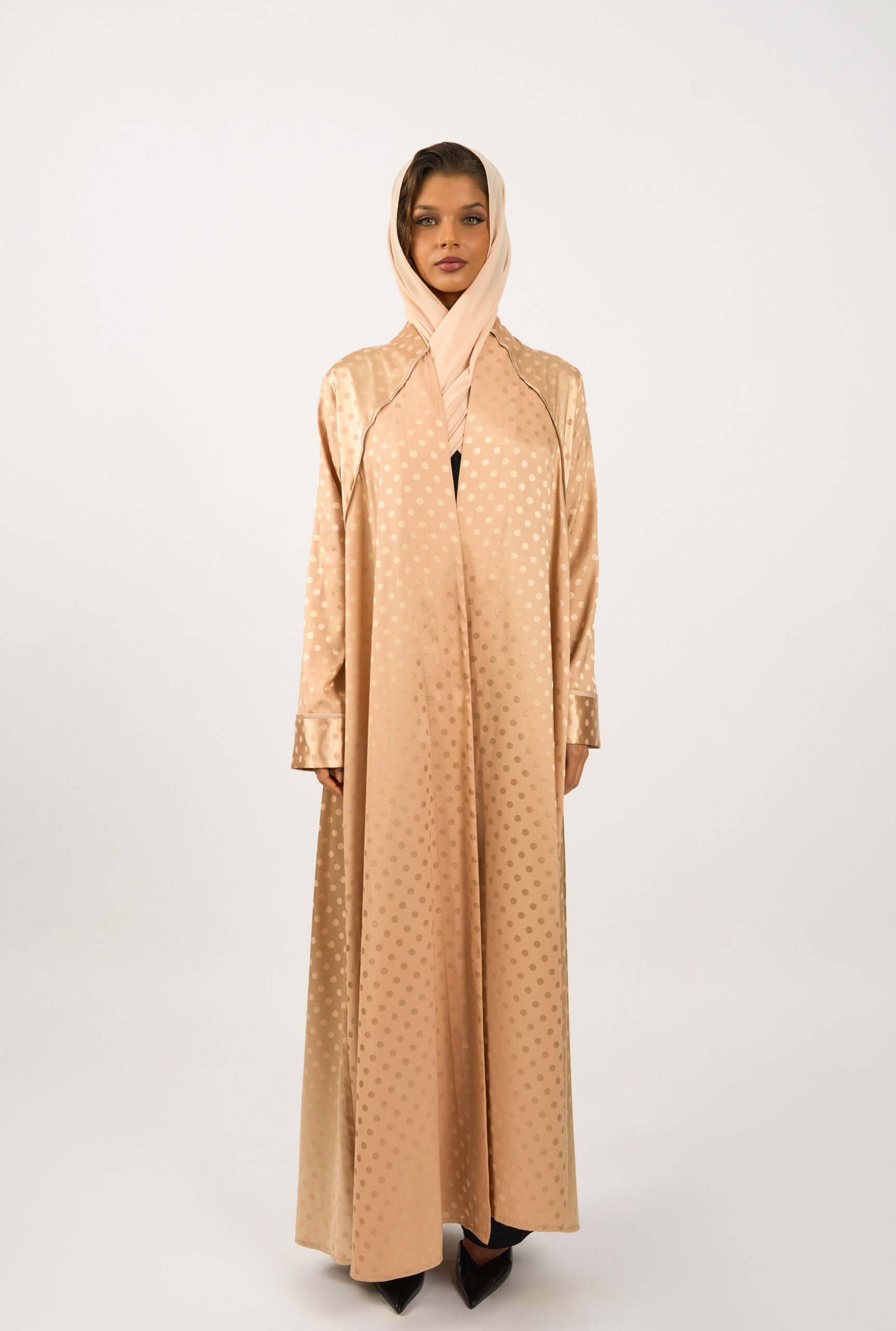 An elegant open abaya crafted from lustrous jacquard fabric featuring subtle polka dots. Designed with a relaxed, flowing silhouette and structured cuffs, this piece drapes beautifully for a refined and graceful look.