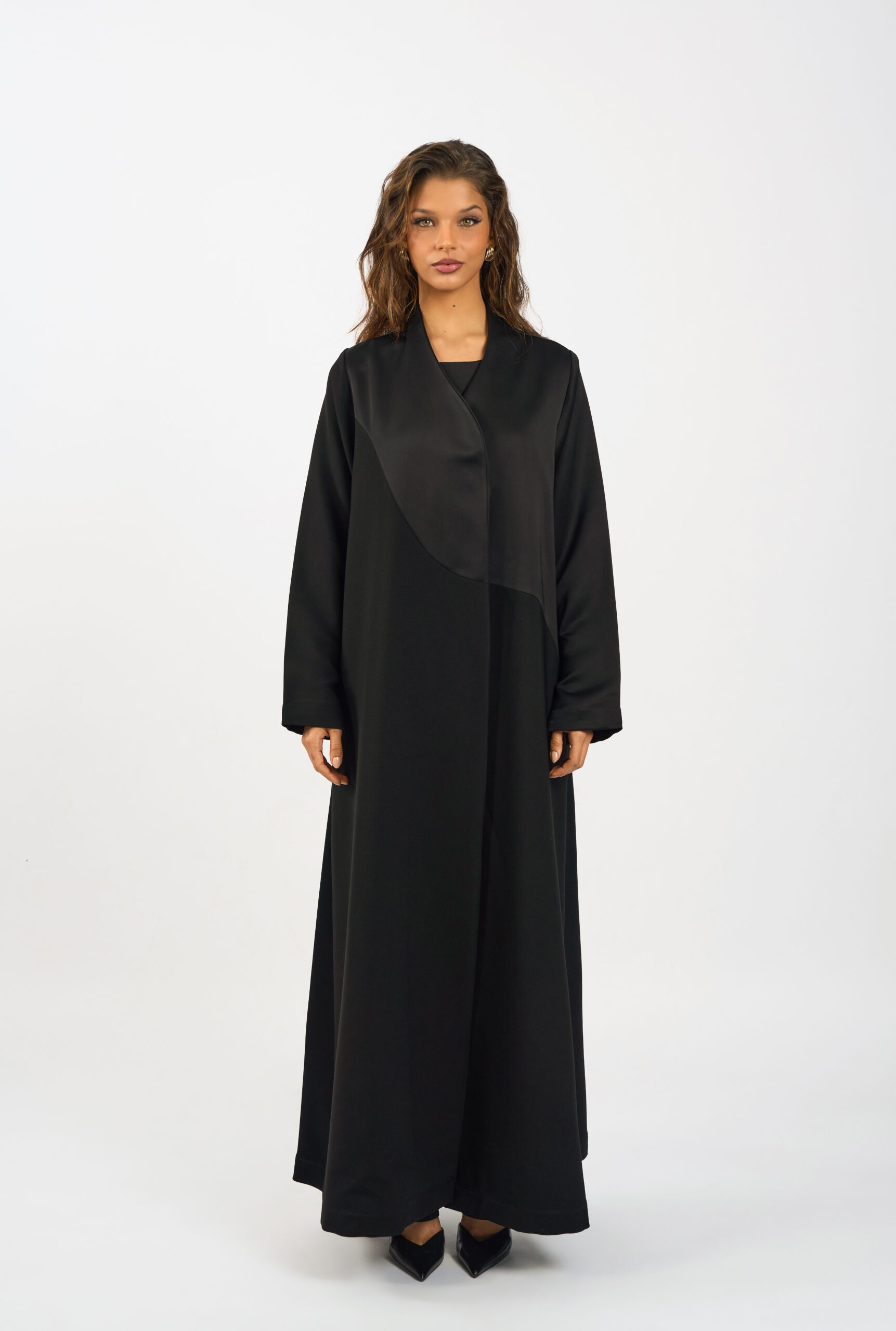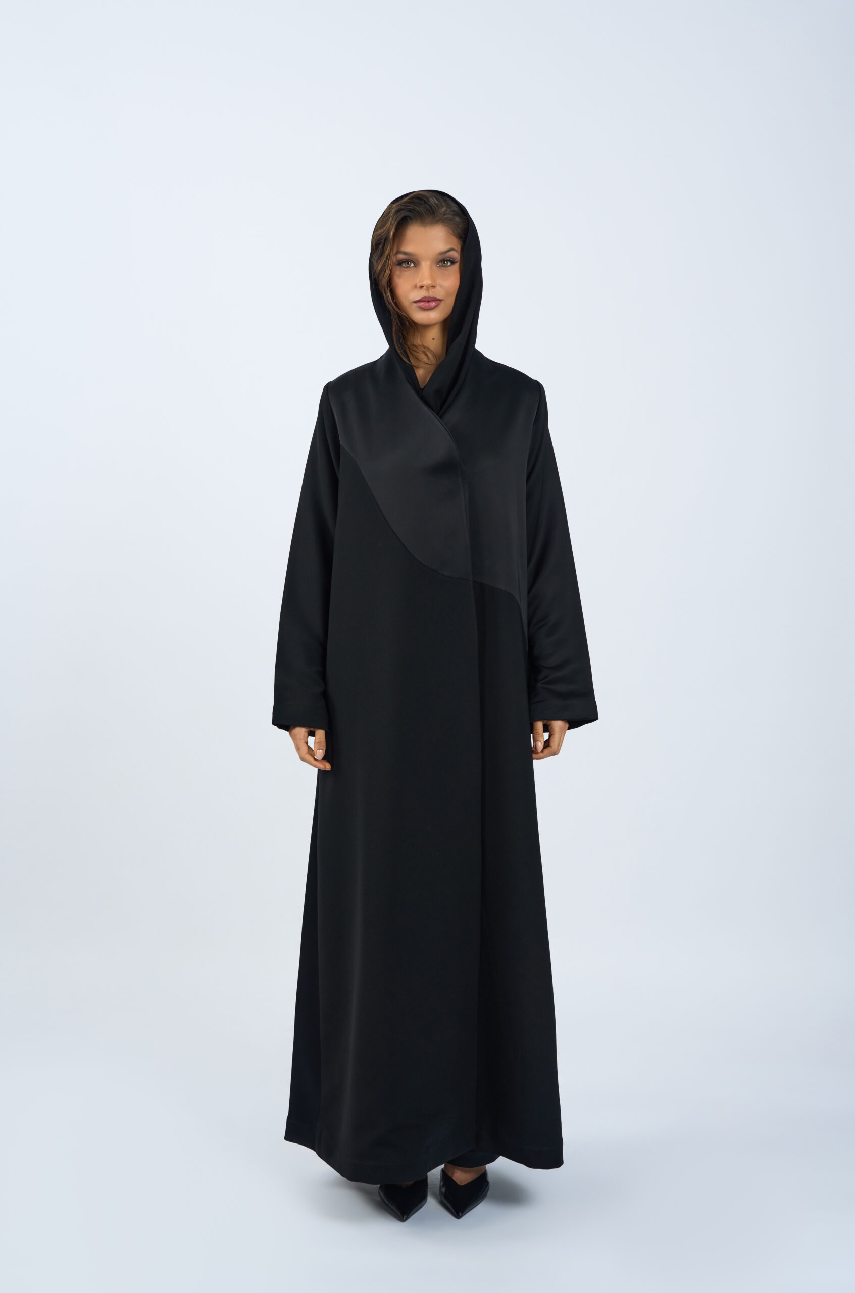 A modern abaya designed with a distinctive asymmetric front panel that adds subtle structure and visual interest. Crafted from smooth, fluid fabric, it features a full-length, relaxed silhouette that drapes elegantly with every step.