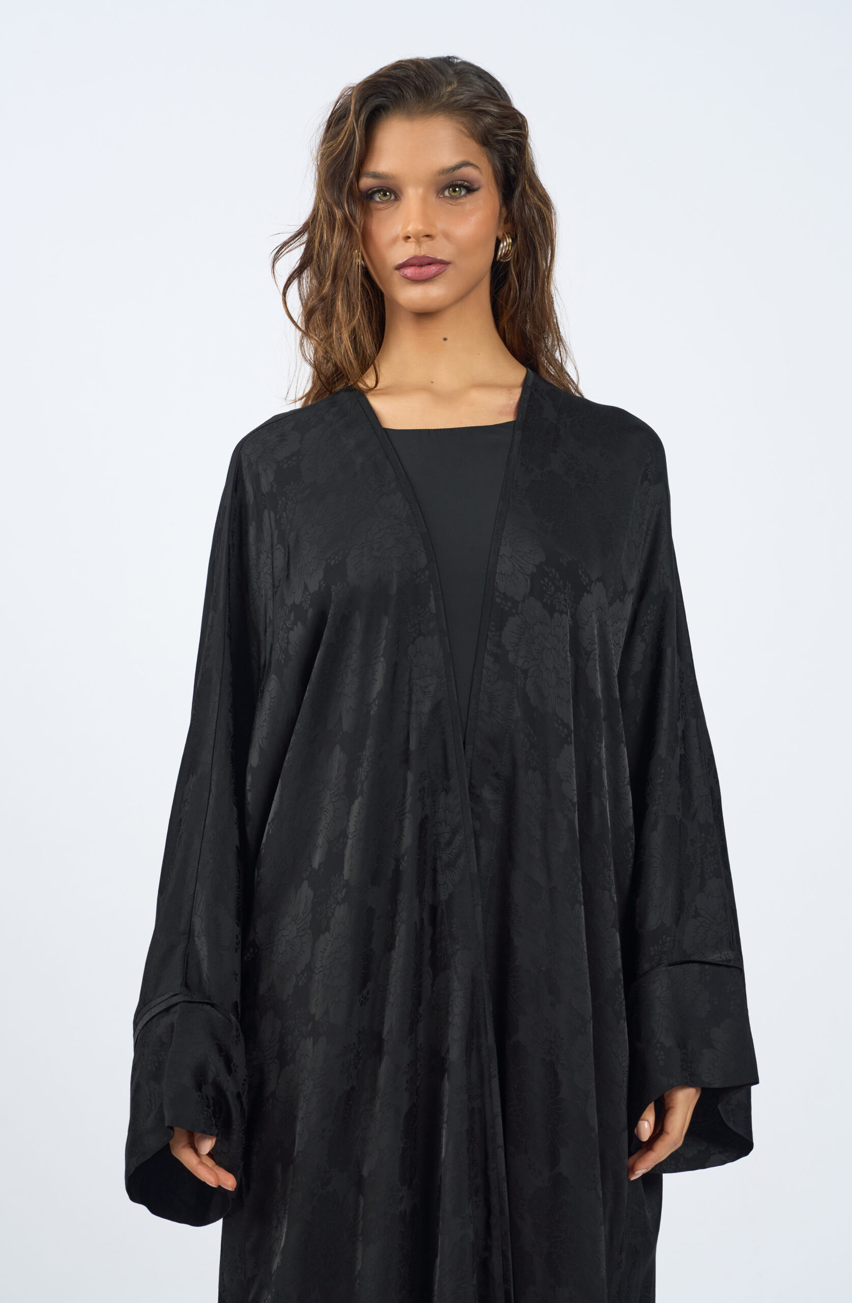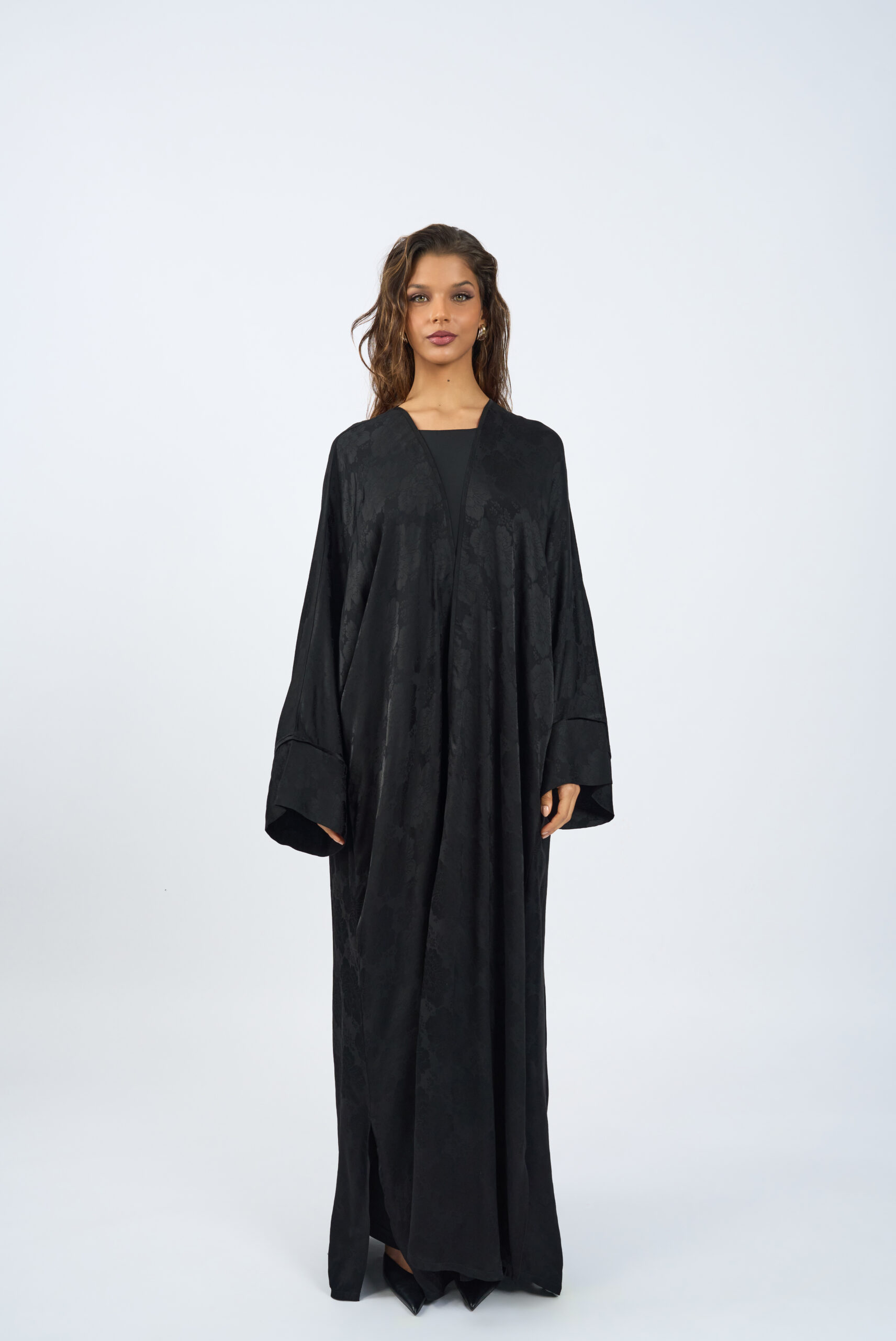An elegant open abaya crafted from richly textured floral jacquard fabric with a subtle sheen. Designed in a classic T-cut silhouette, it offers a relaxed, flowing fit with wide sleeves for effortless movement and comfort.