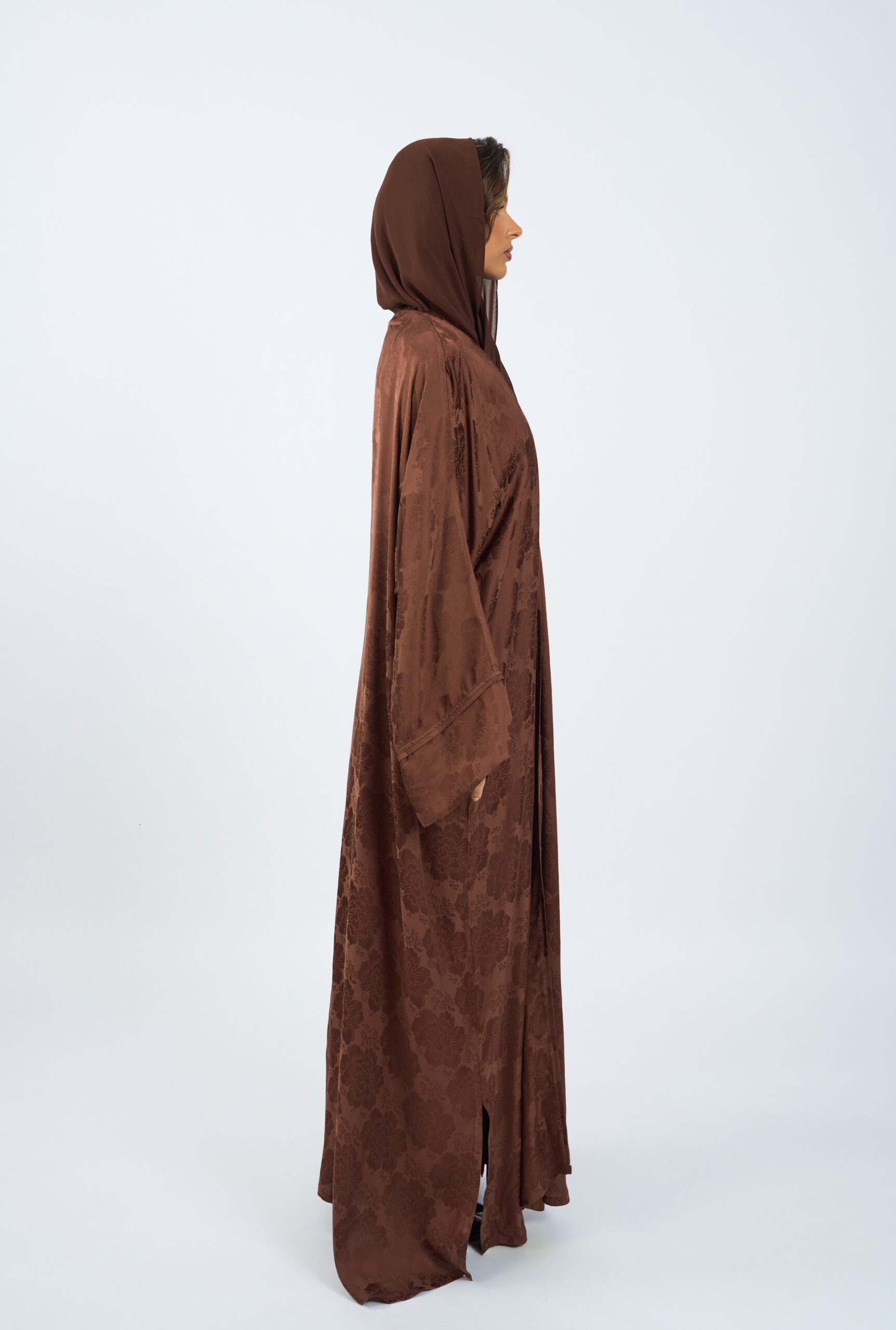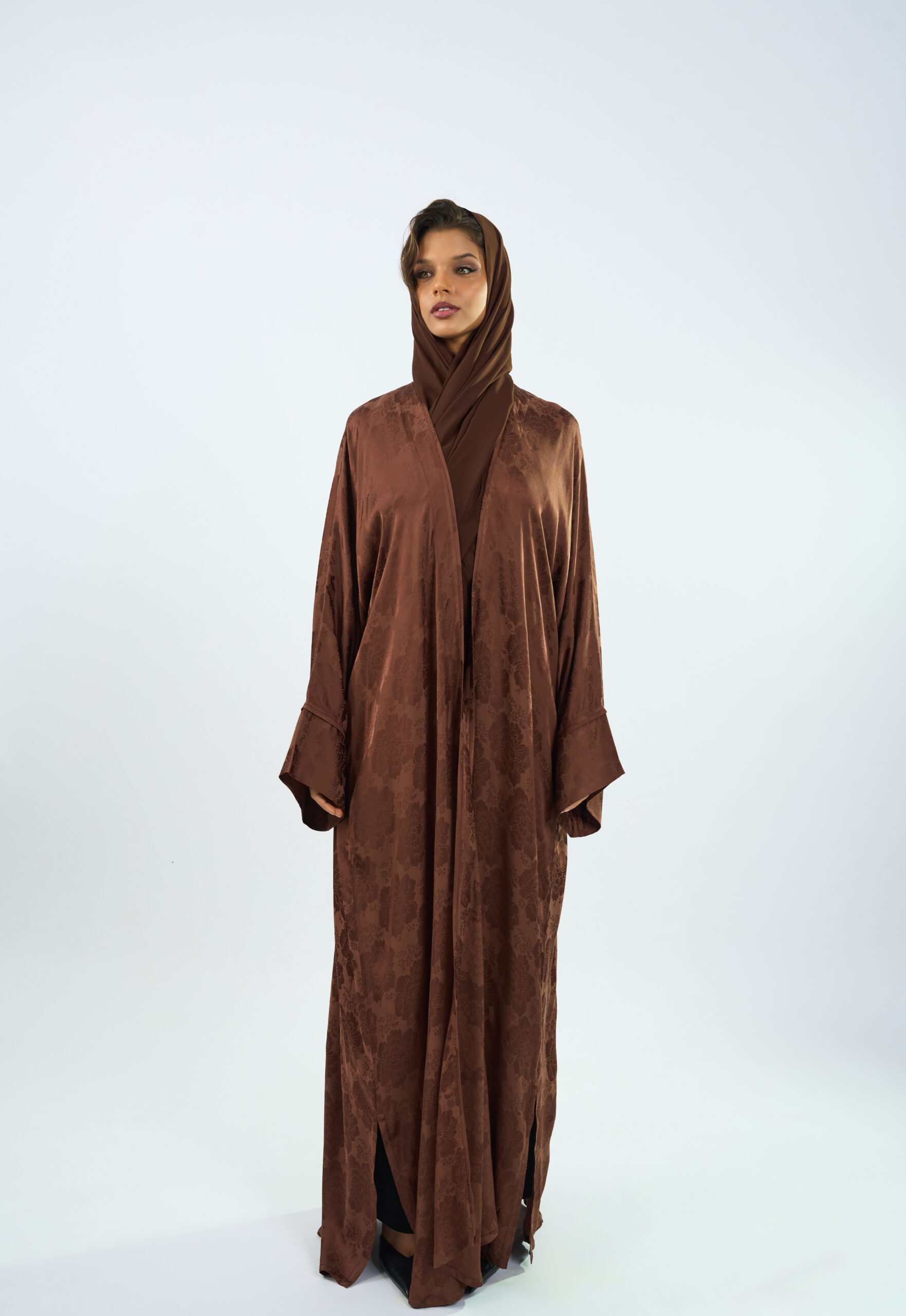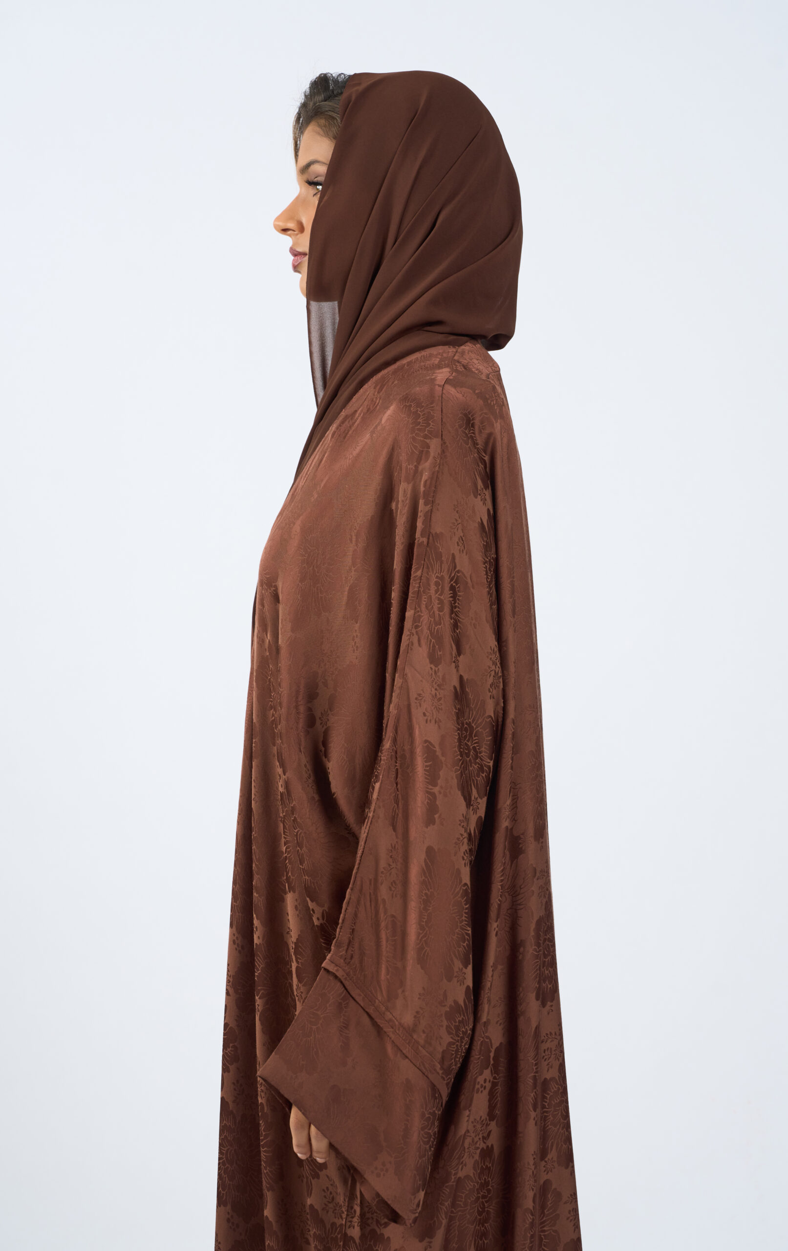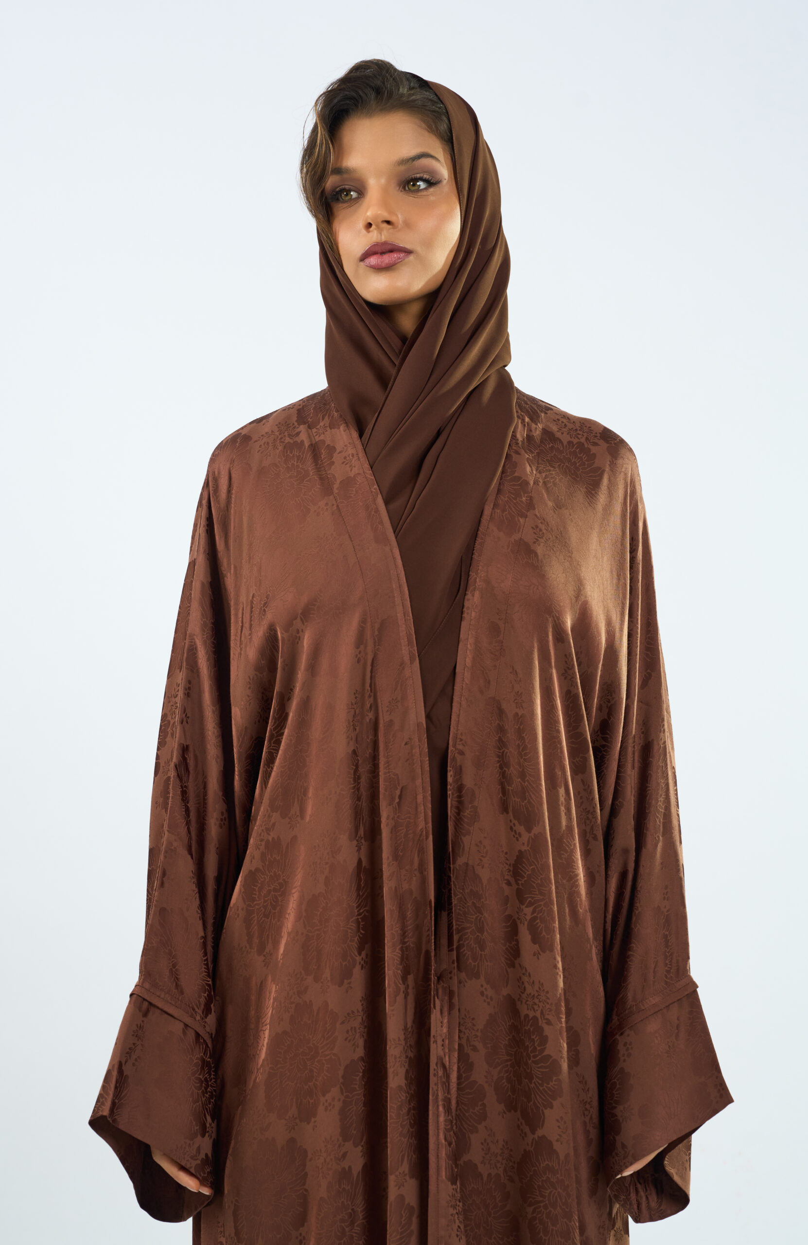 An elegant open abaya crafted from richly textured floral jacquard fabric with a subtle sheen. Designed in a classic T-cut silhouette, it offers a relaxed, flowing fit with wide sleeves for effortless movement and comfort.