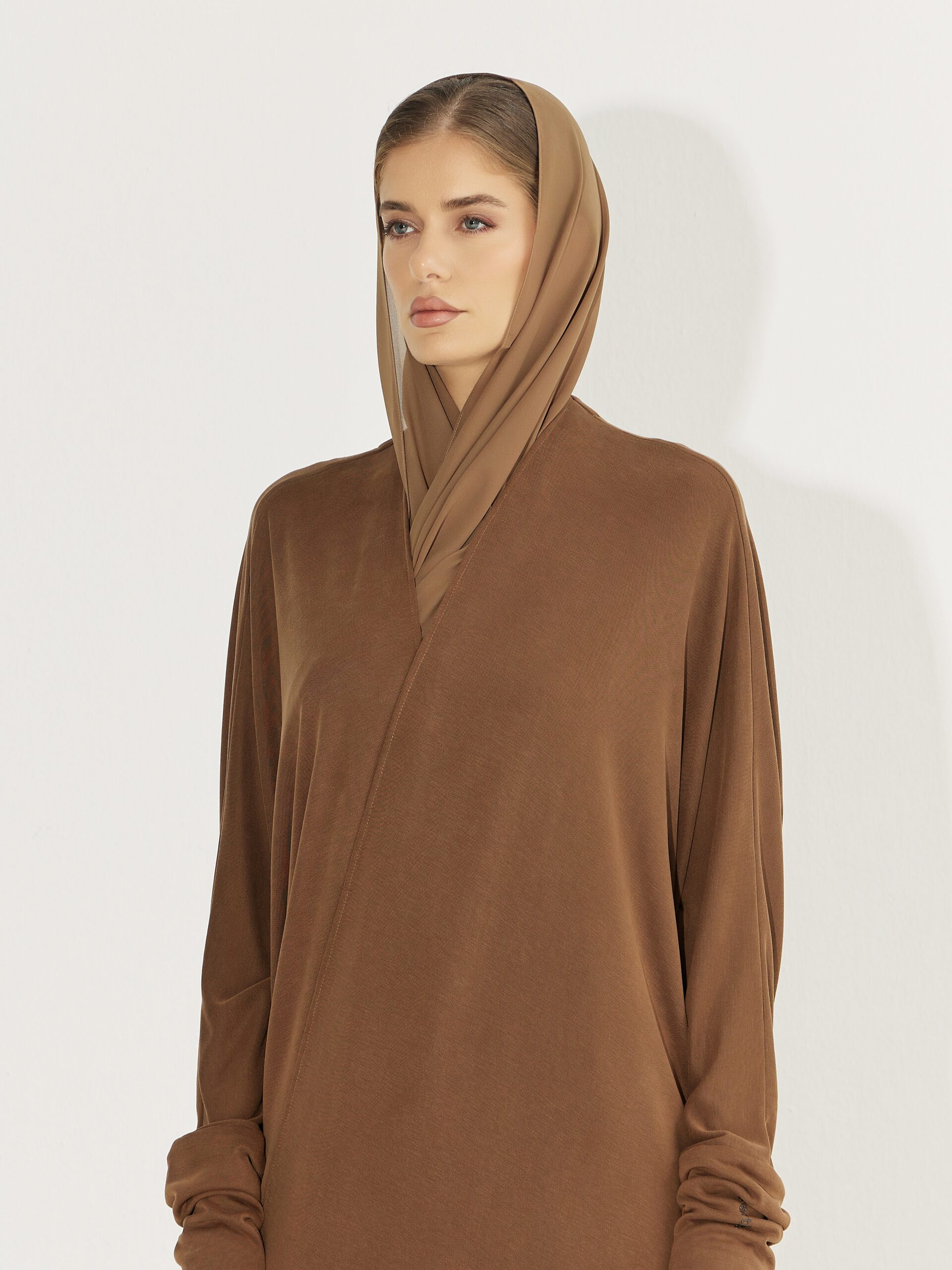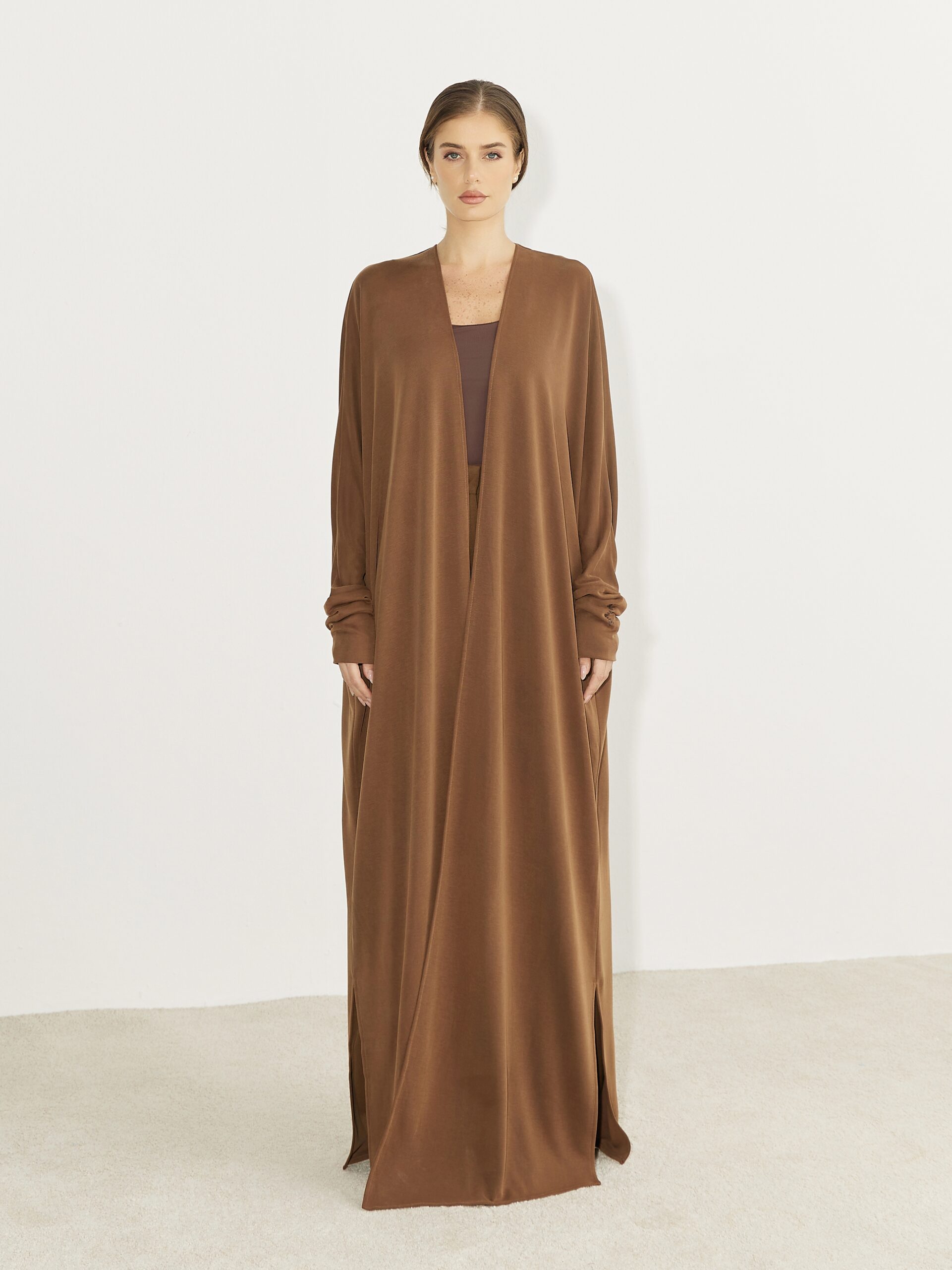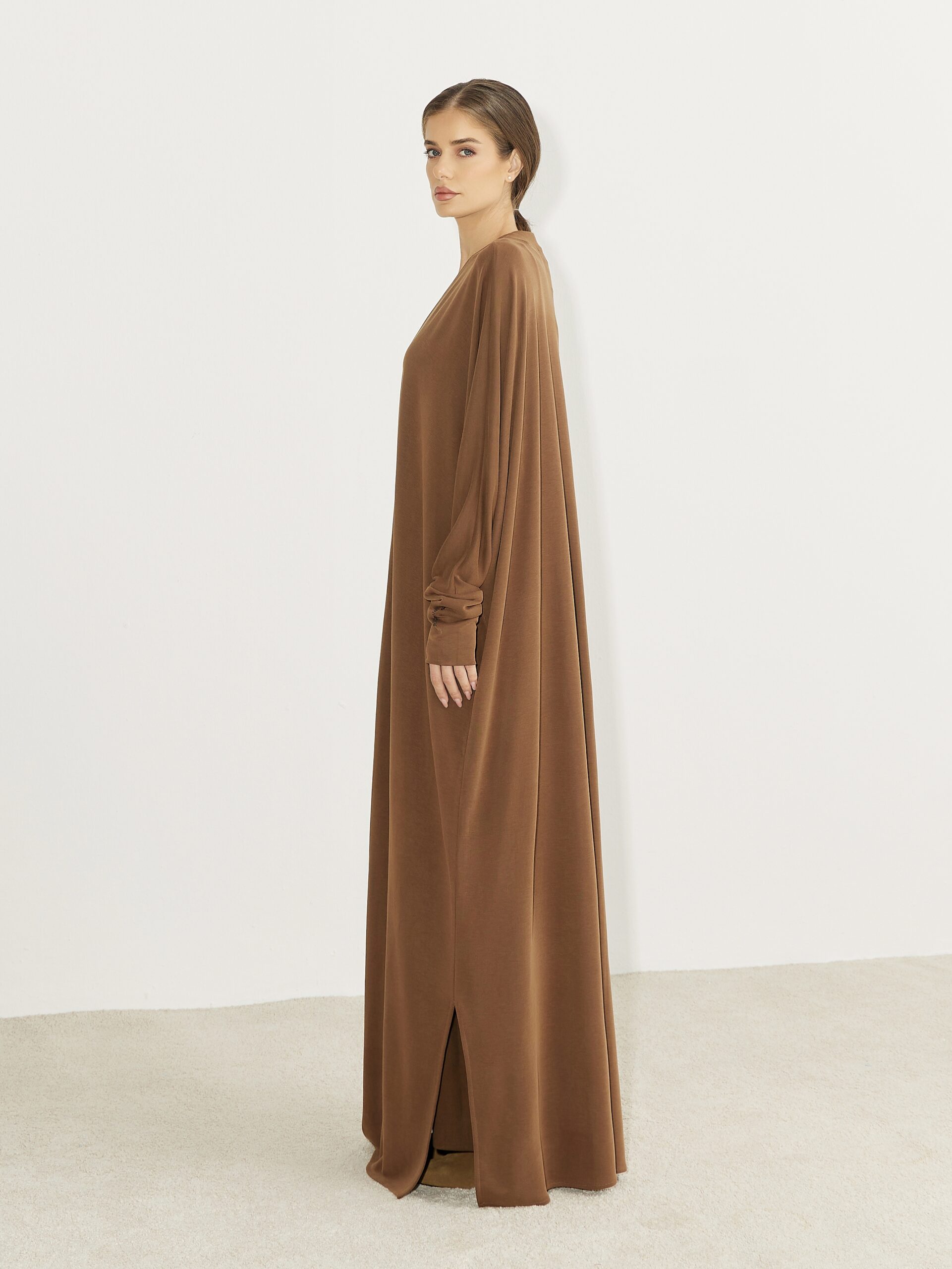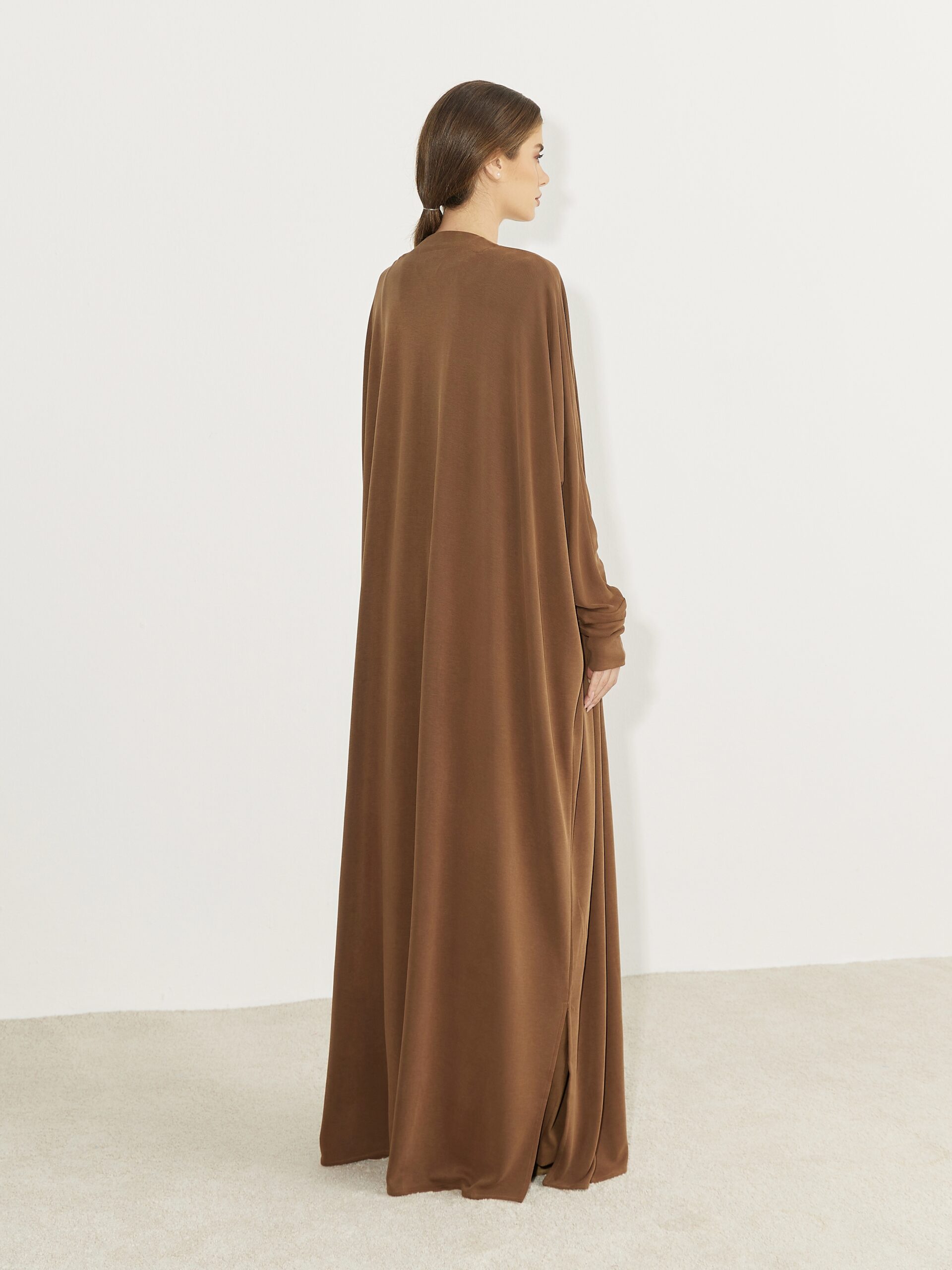 Soft, lightweight jersey abaya with an elegant drape and relaxed fit. Designed for comfort and effortless modesty. Featuring a wrap-style front and fitted wide sleeves.