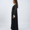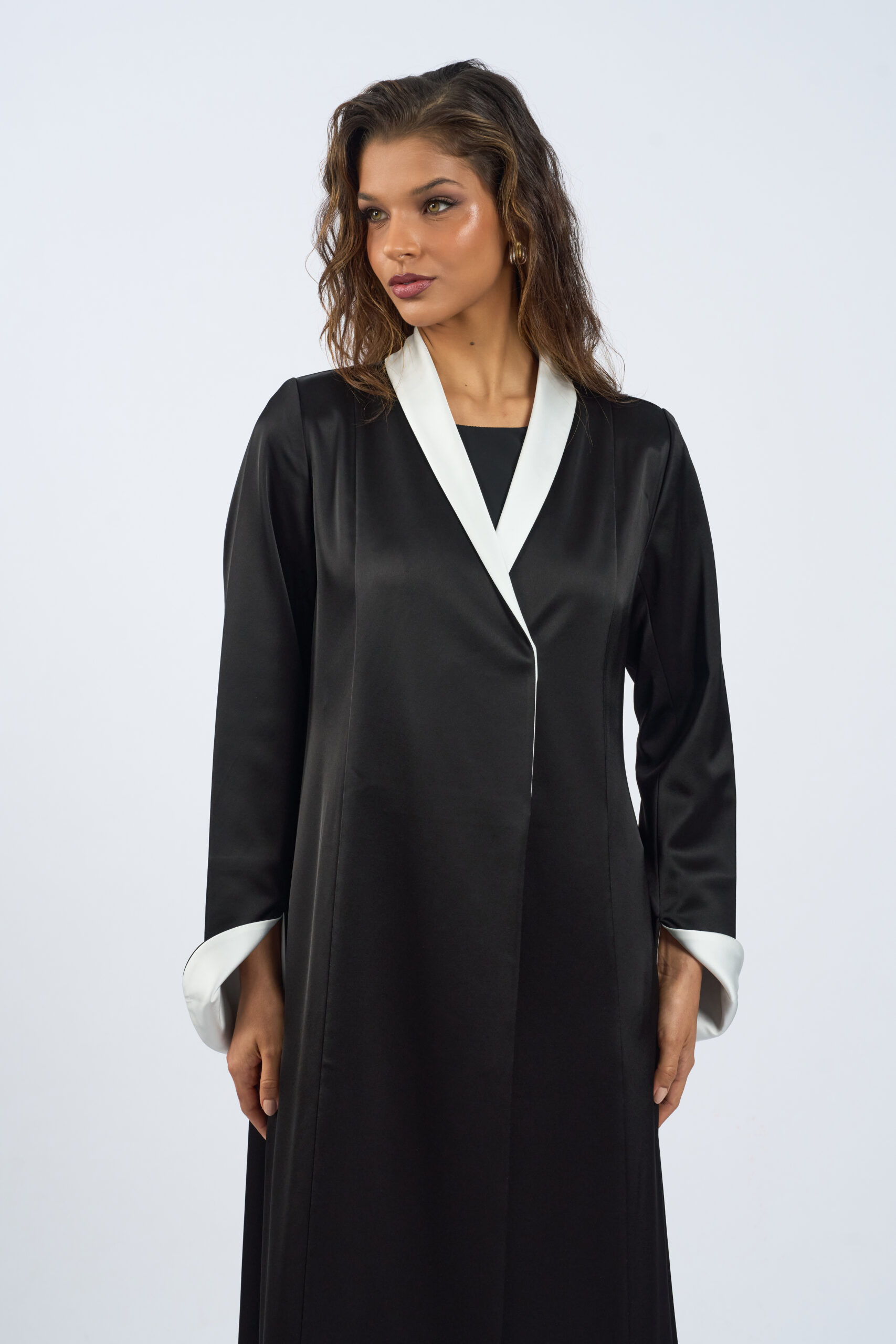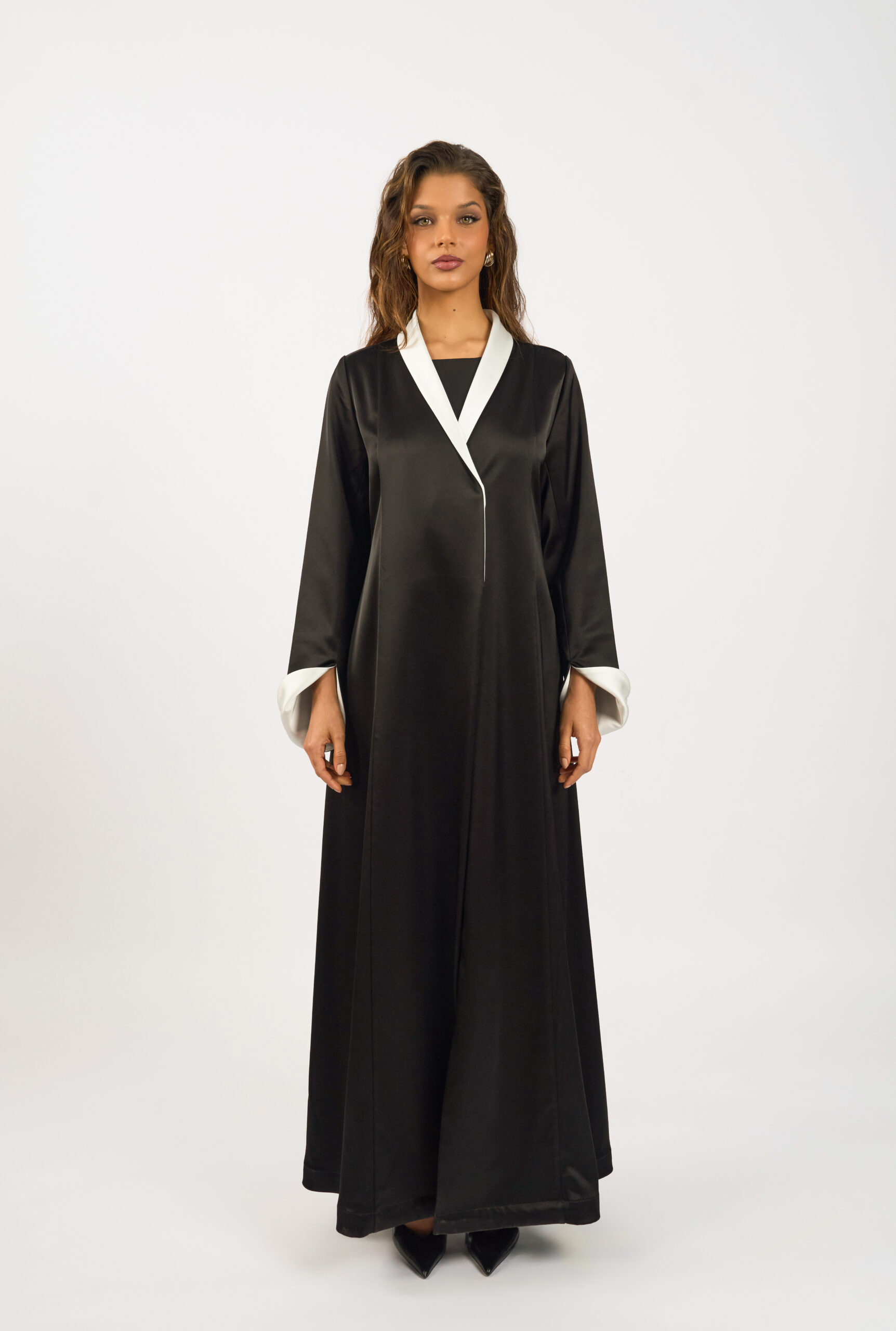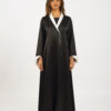 A sleek and sophisticated abaya designed with a clean, minimalist silhouette. Crafted from smooth, fluid fabric, this full-length piece features a sharp V-neckline accented with contrast trim for a refined, modern touch.