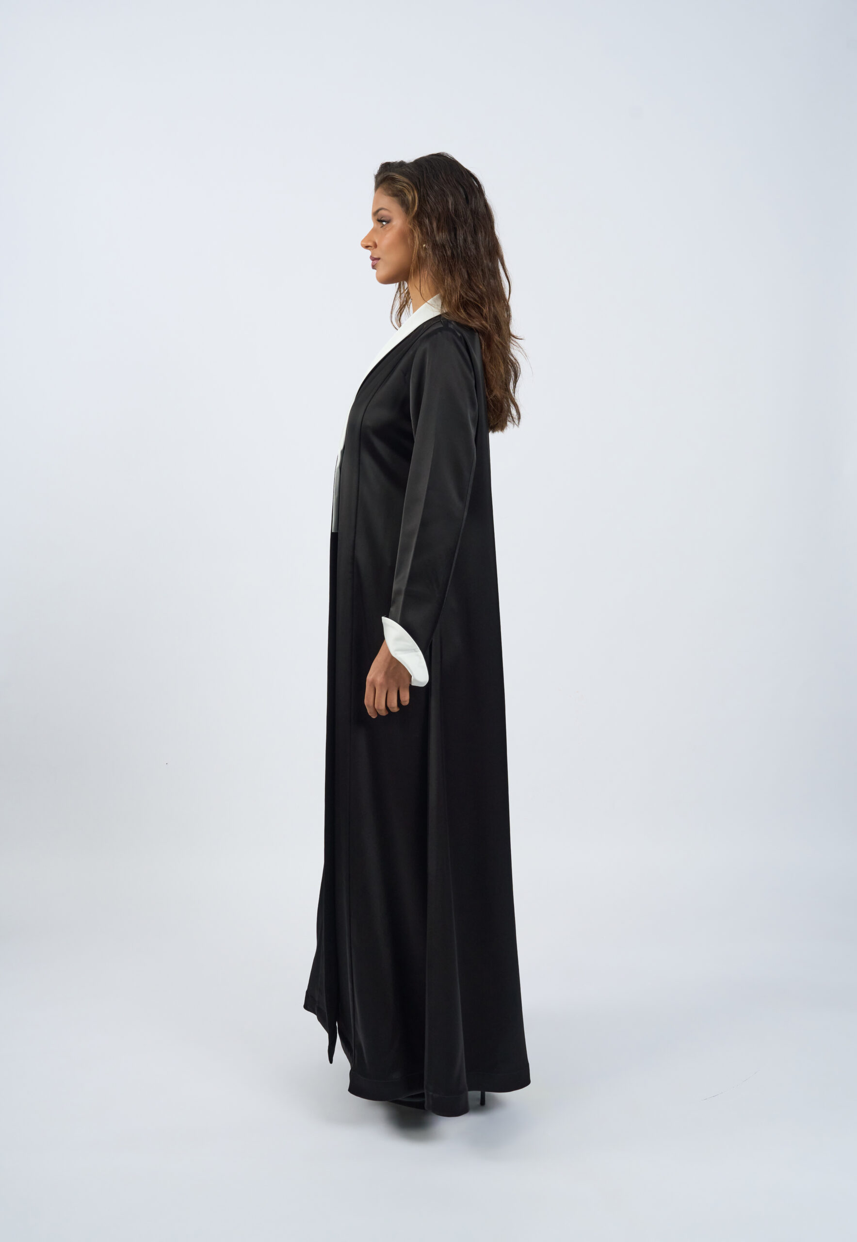 The tailored cuffs with coordinating contrast detail add subtle definition, while the streamlined cut ensures effortless elegance and graceful movement. Perfect for formal occasions, work settings, or elevated everyday wear, this abaya is a timeless wardrobe essential with contemporary appeal.