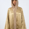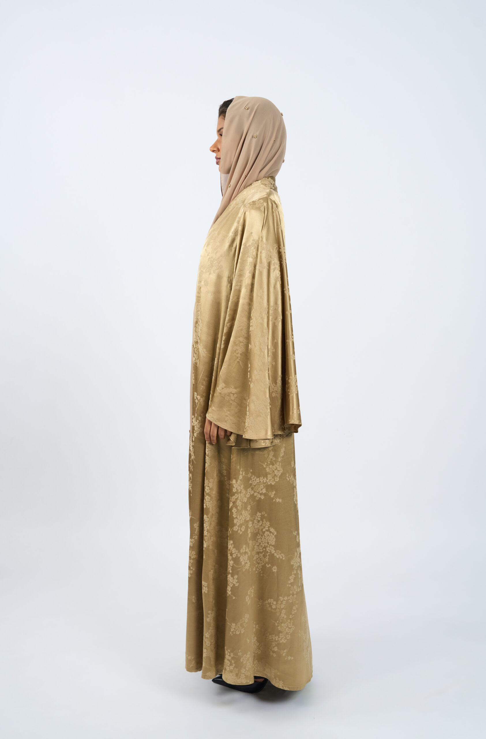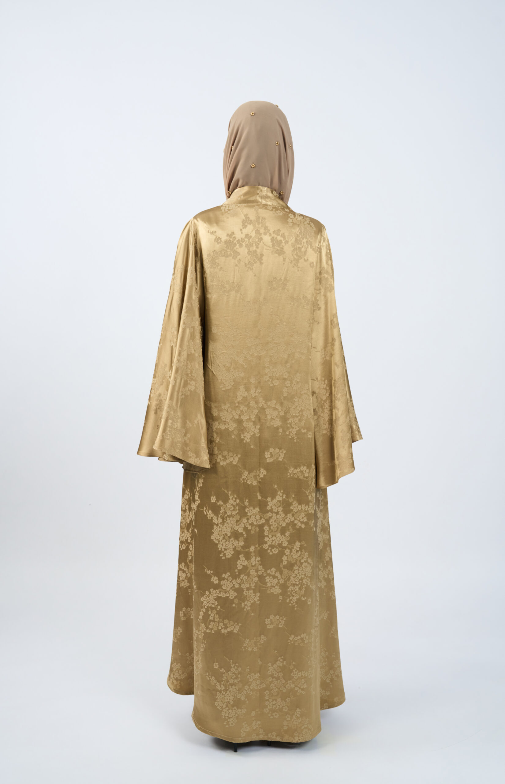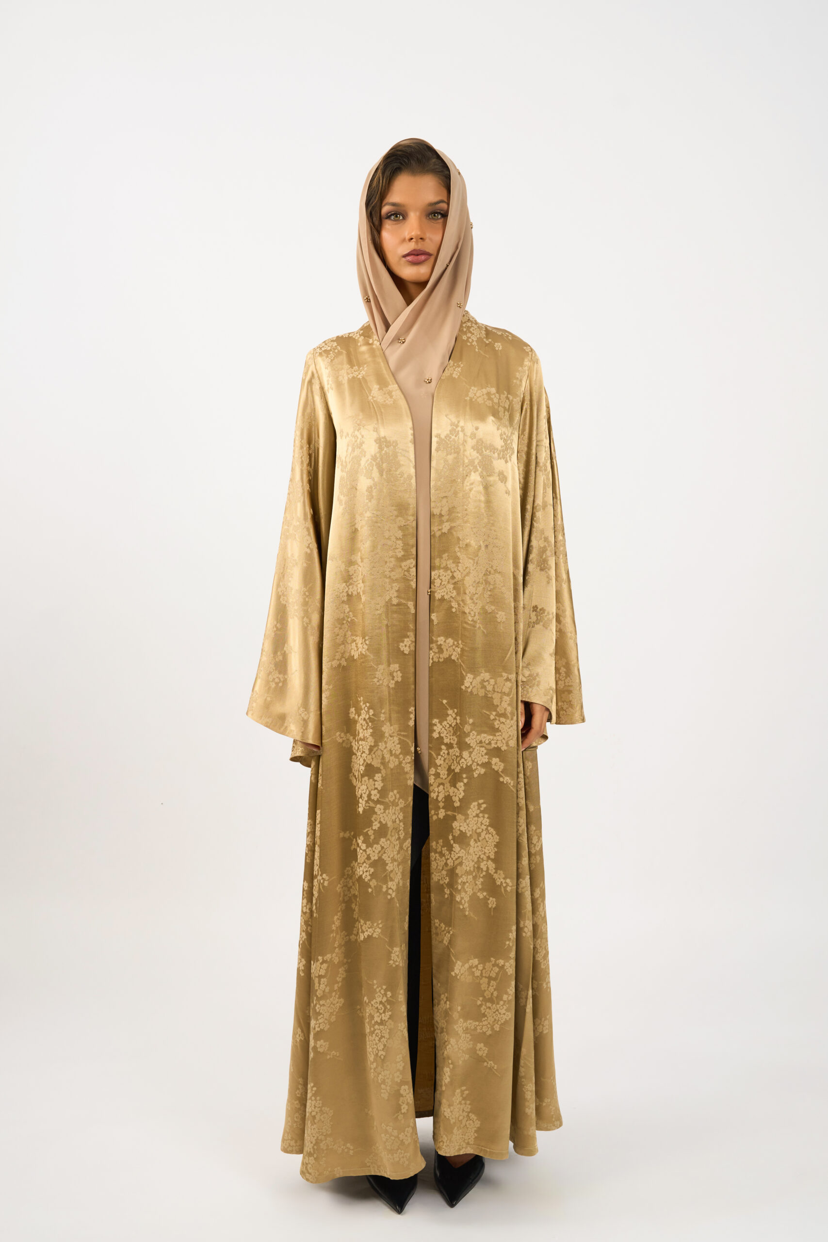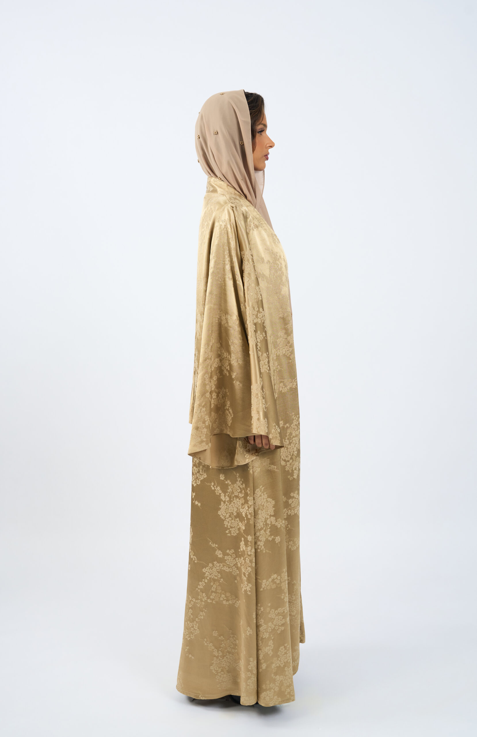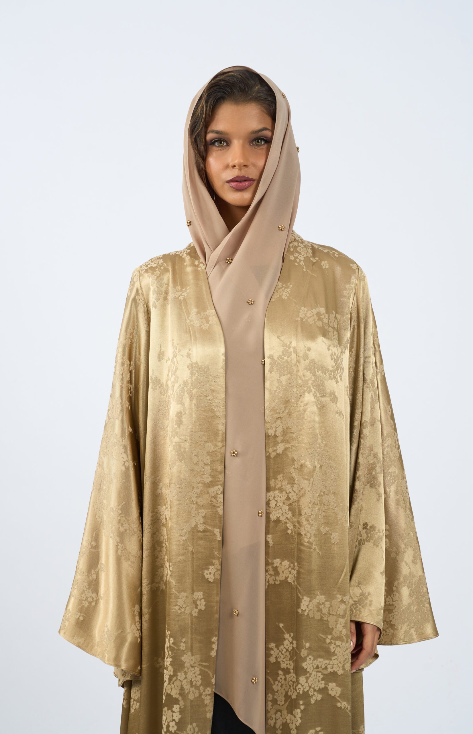 A refined abaya crafted from a softly lustrous jacquard fabric featuring delicate floral detailing throughout. Designed with a flowing, full-length silhouette and wide sleeves, this piece drapes beautifully for a graceful and sophisticated look.