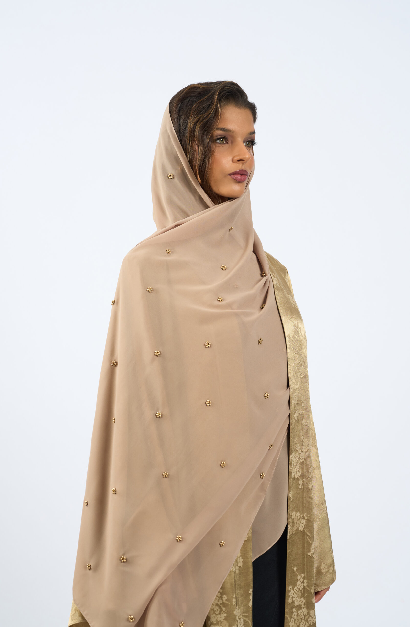 Paired with a coordinating embellished sheila, adorned with subtle bead accents, it offers a touch of understated sparkle. Perfect for formal gatherings and special occasions, this abaya embodies timeless elegance with a modern finish.