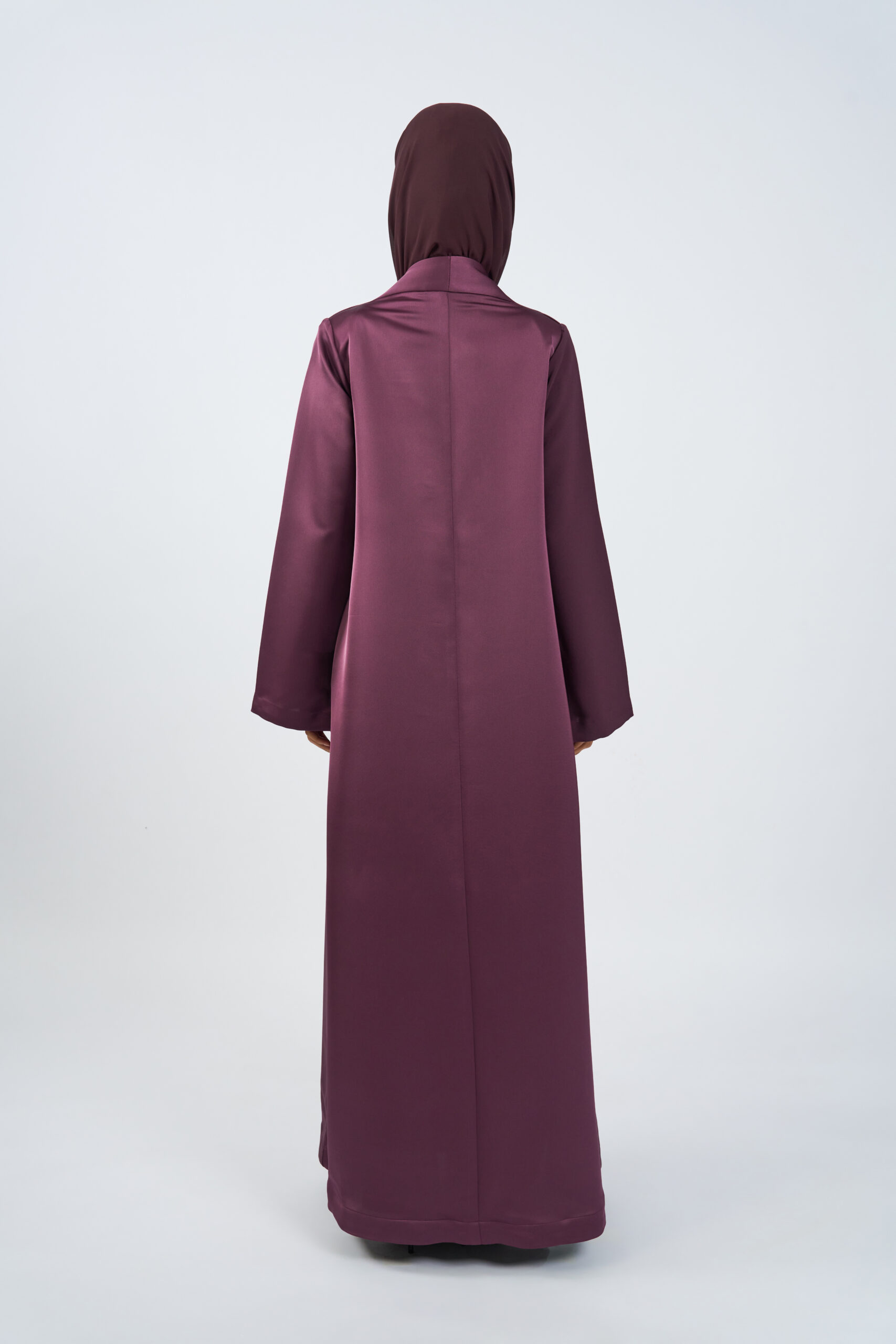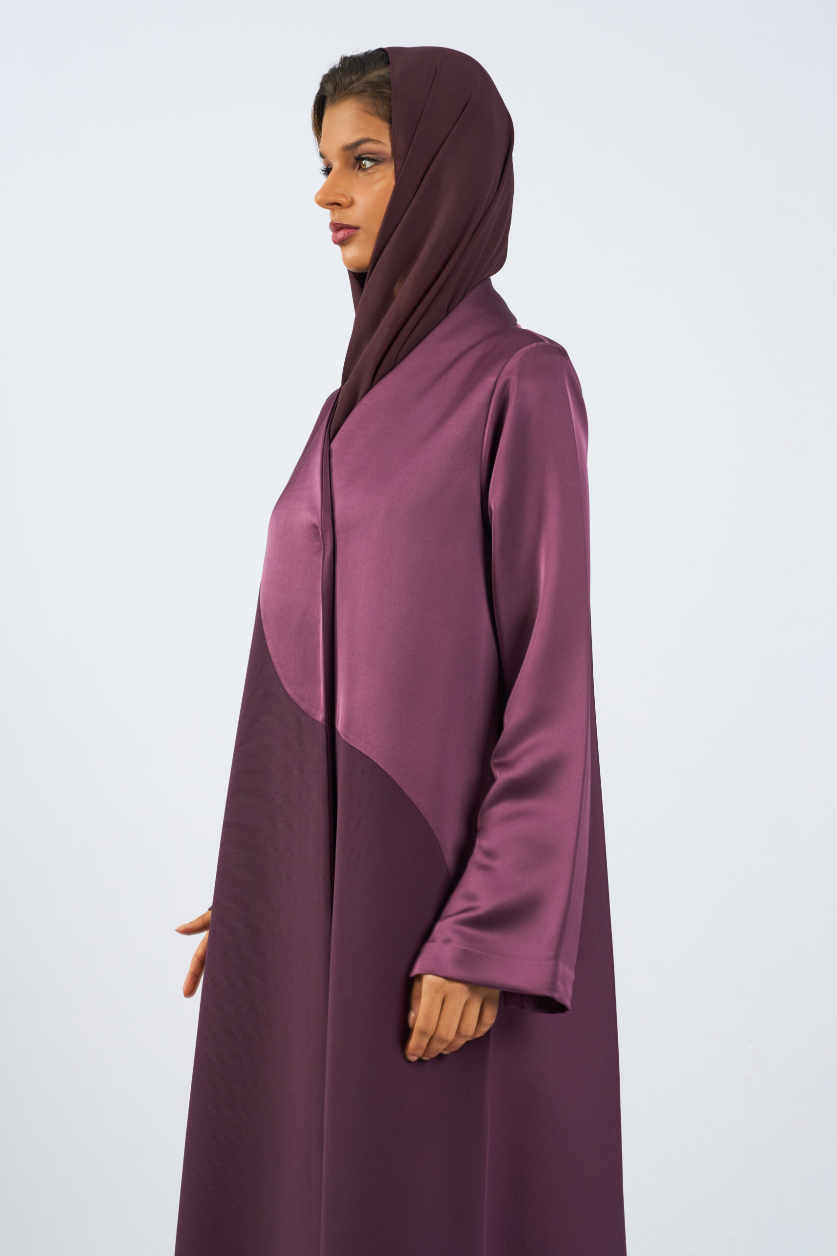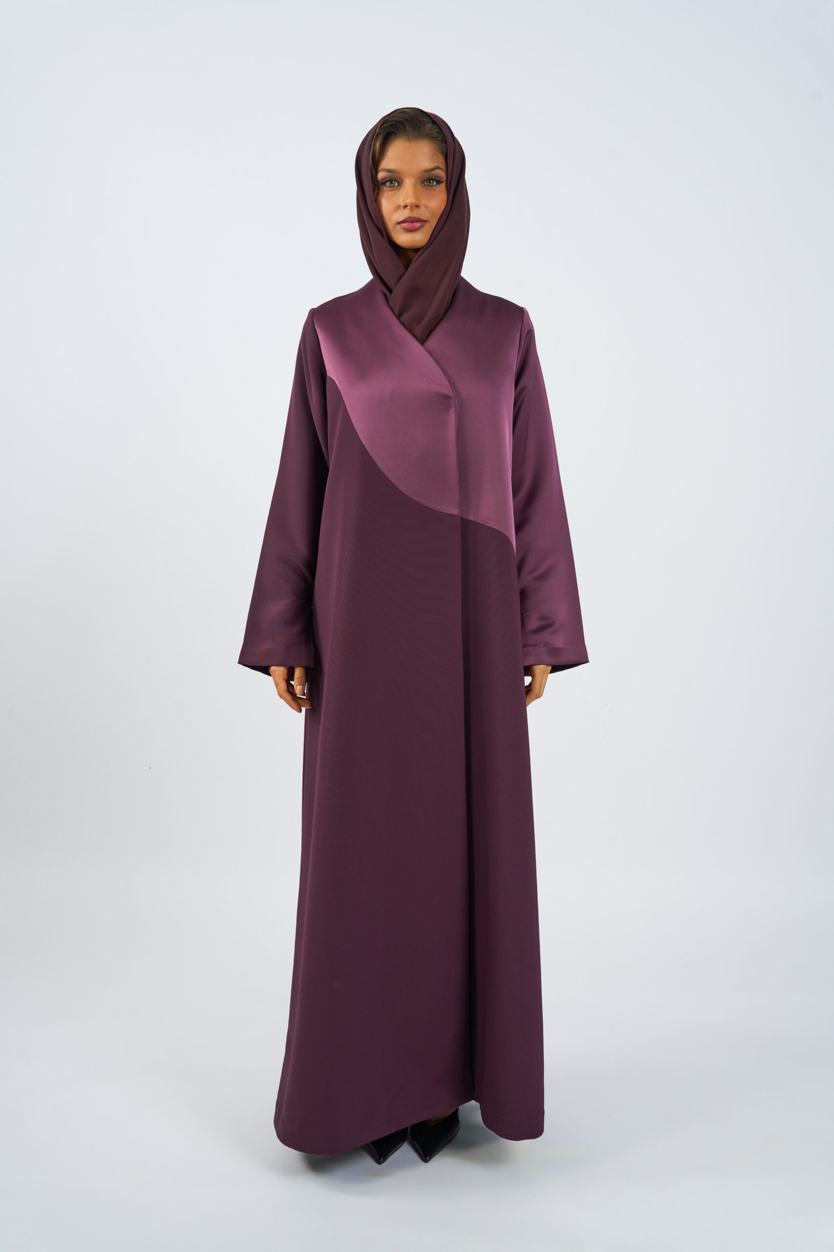 A modern abaya designed with a distinctive asymmetric front panel that adds subtle structure and visual interest. Crafted from smooth, fluid fabric, it features a full-length, relaxed silhouette that drapes elegantly with every step.