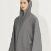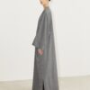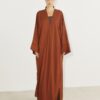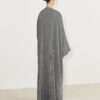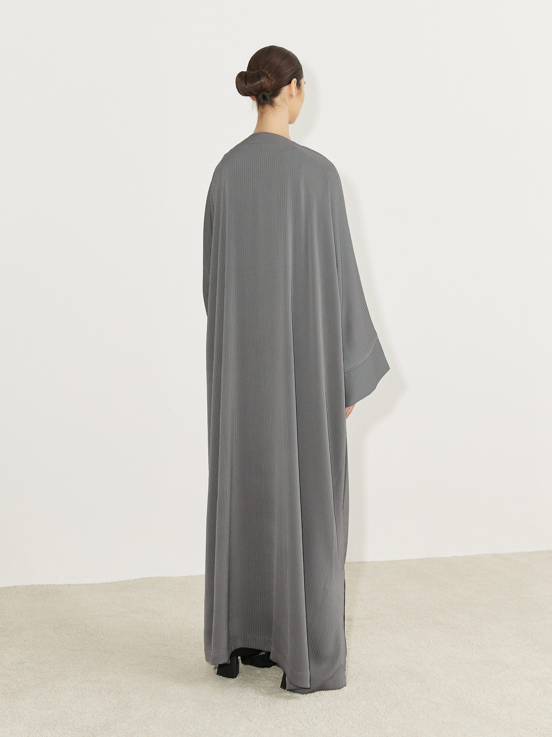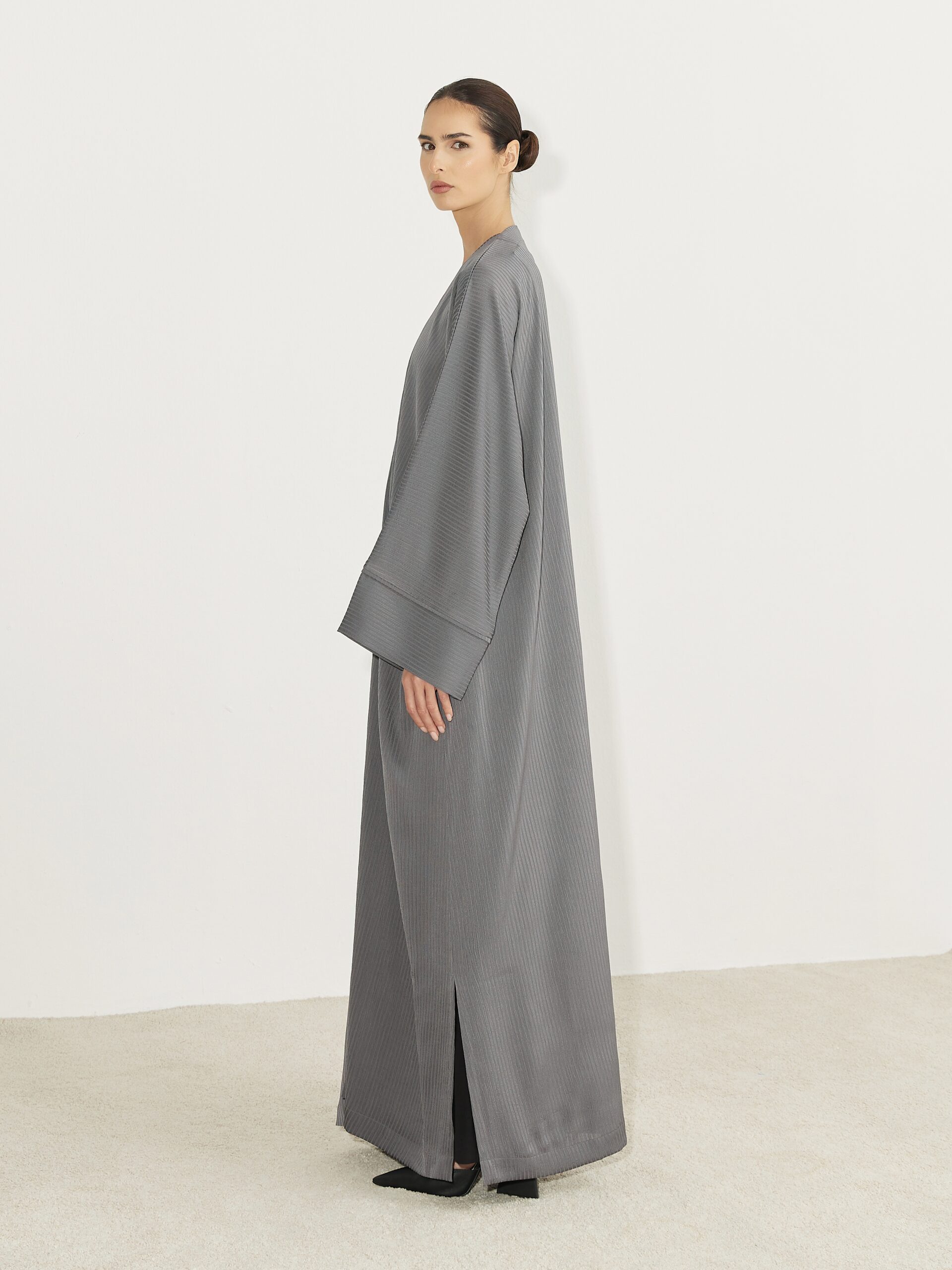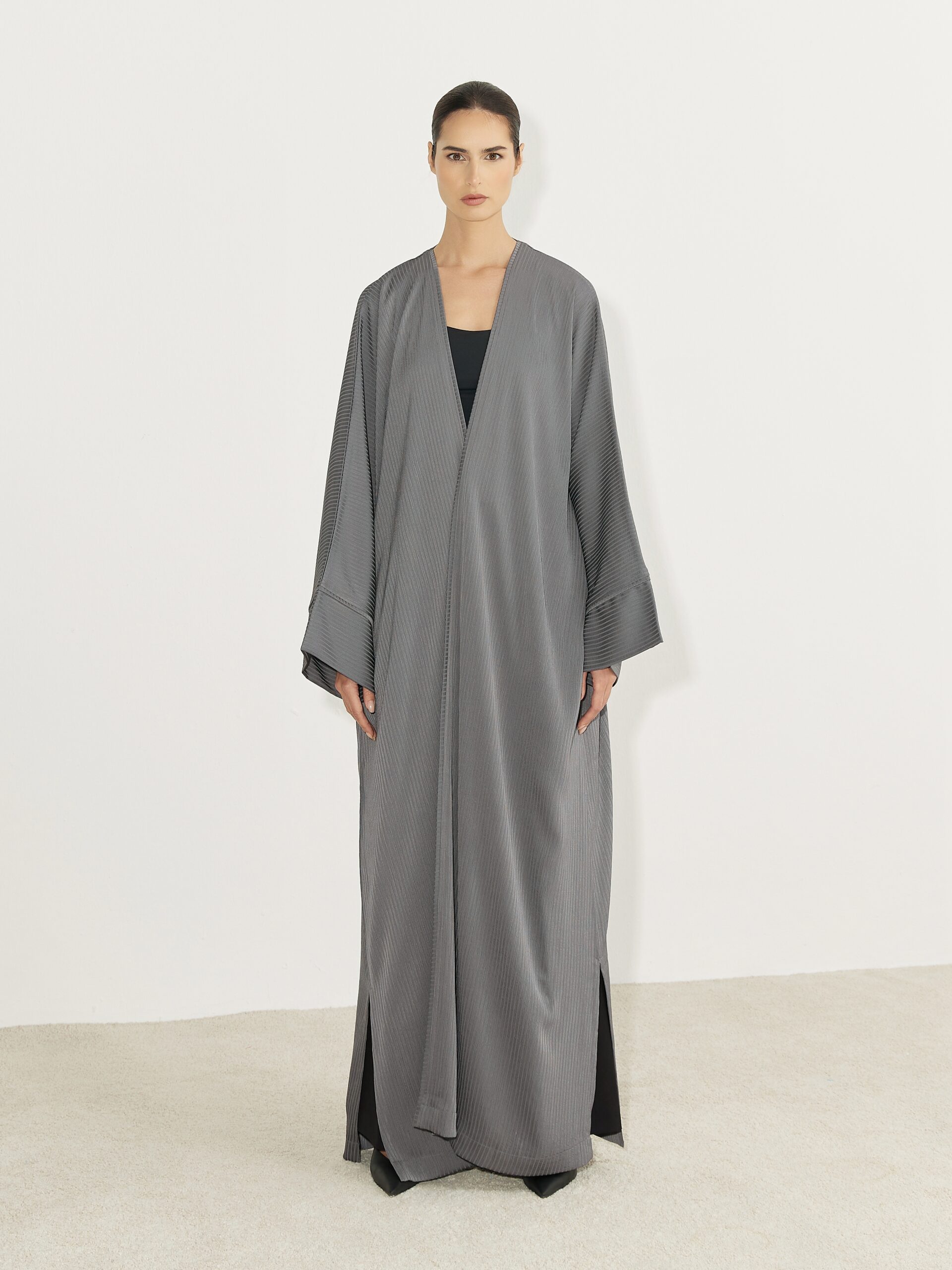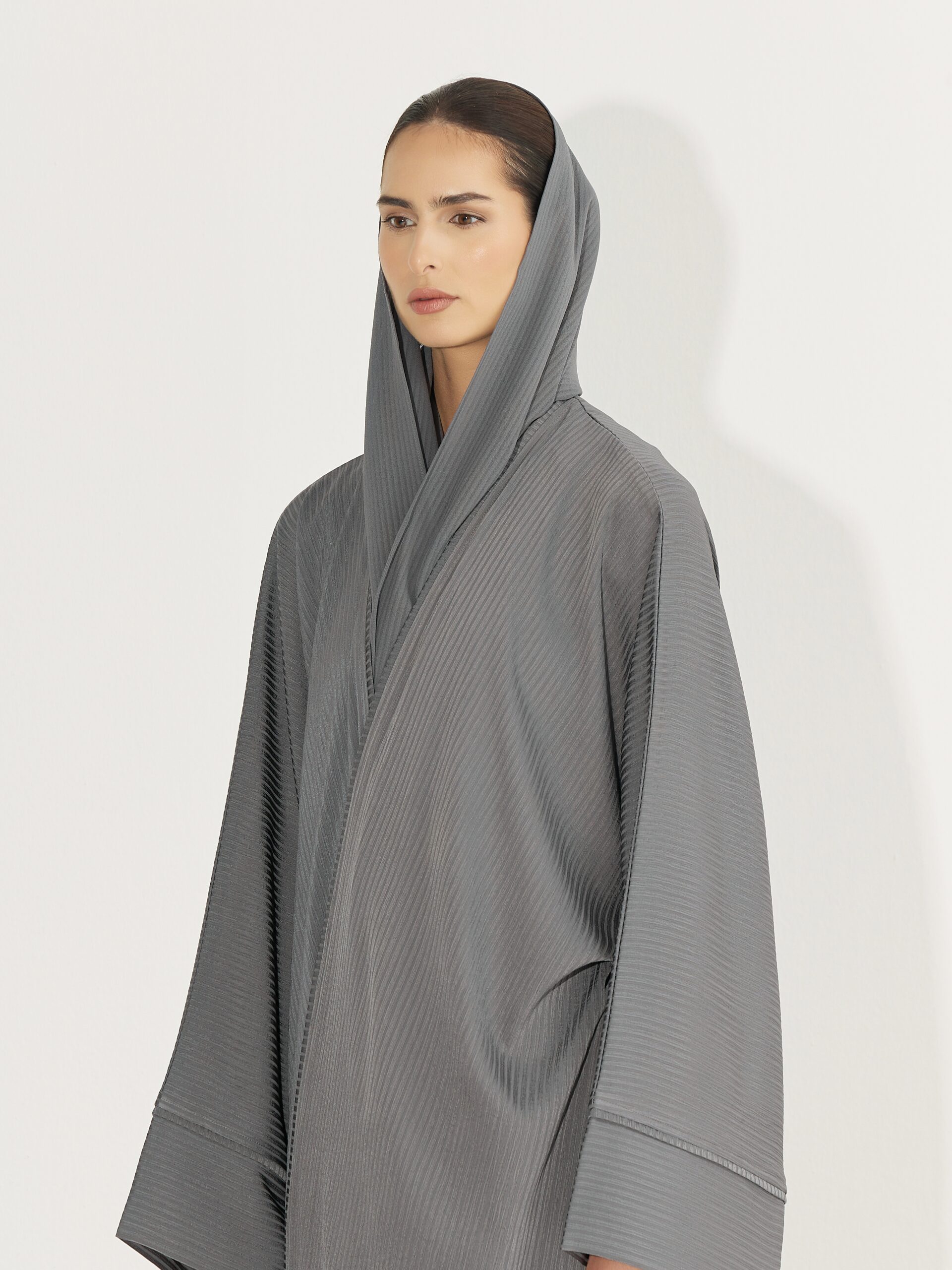 Elegant pleated abaya crafted from a lightweight silk-touch fabric with a soft, fluid drape, featuring wide sleeves and a relaxed, modest fit for effortless wear, comes with a matching striped sheila to complete the look.