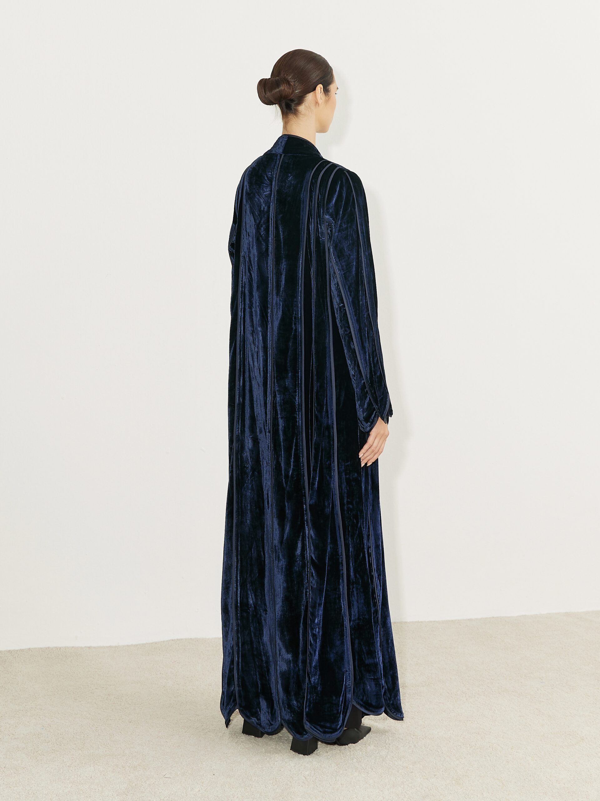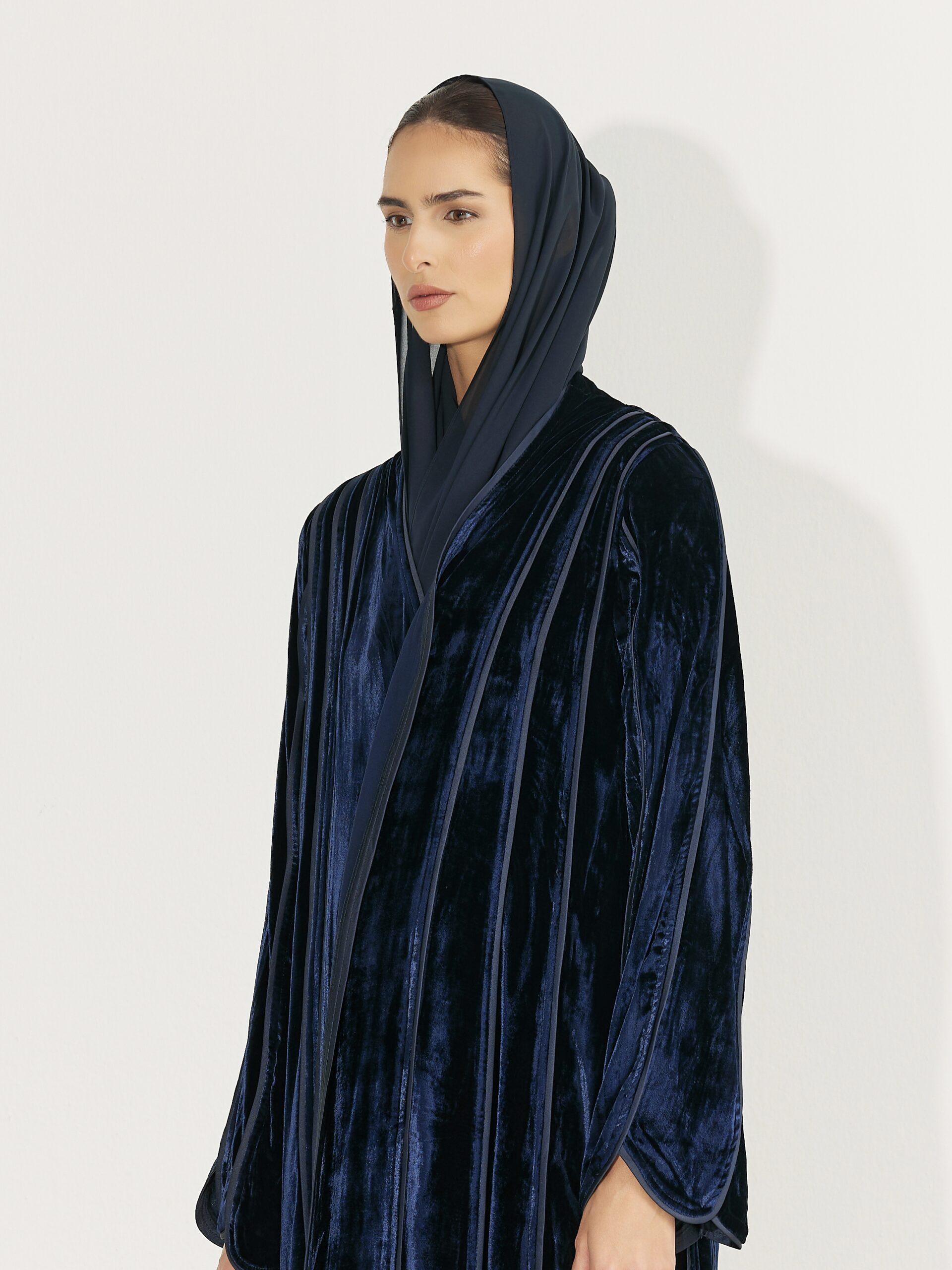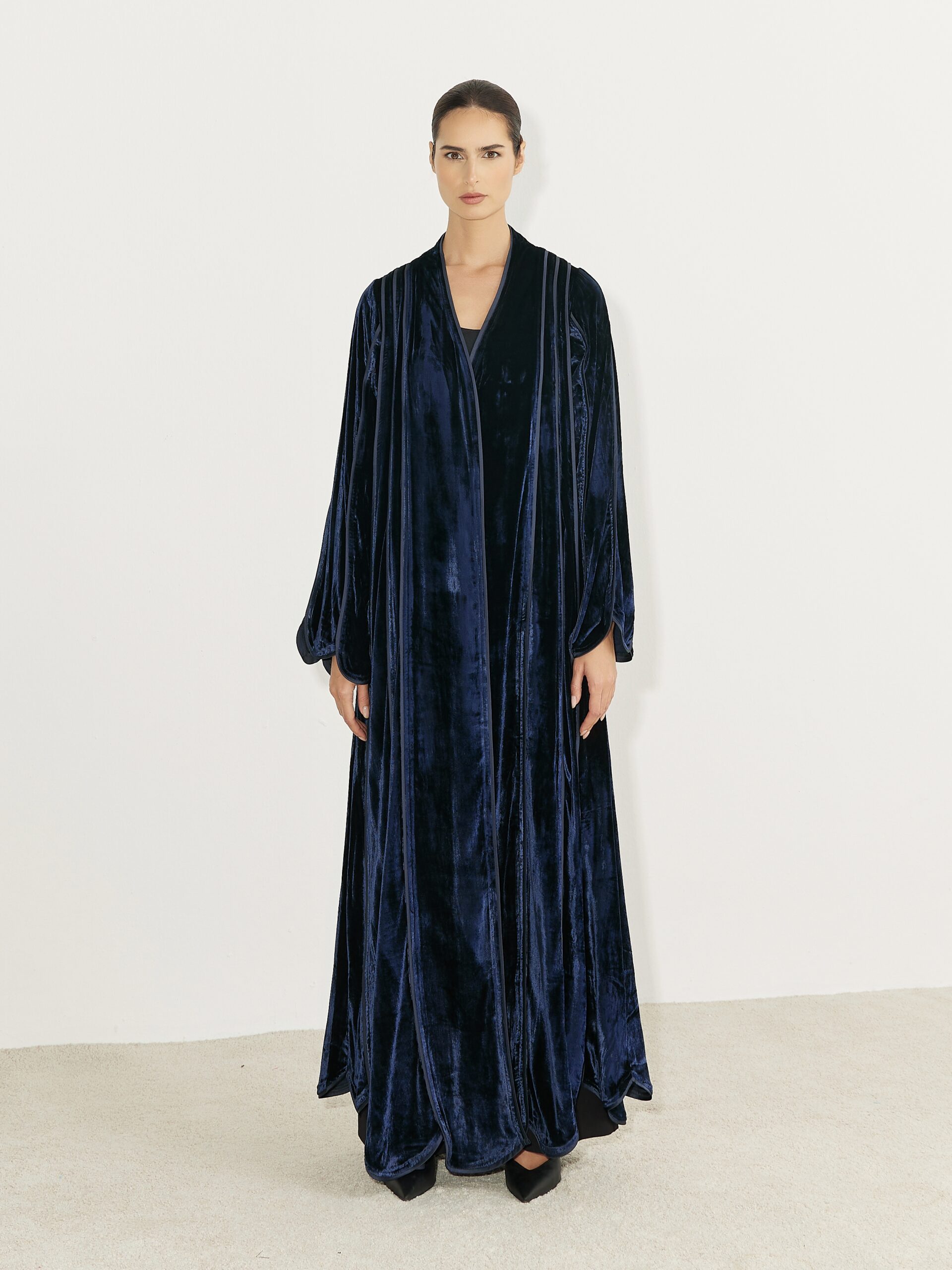 An elegant open abaya crafted from soft, flowing velvet. Designed with a relaxed silhouette, it offers effortless sophistication for both day and evening wear. Perfect for layering over casual or formal wear.