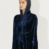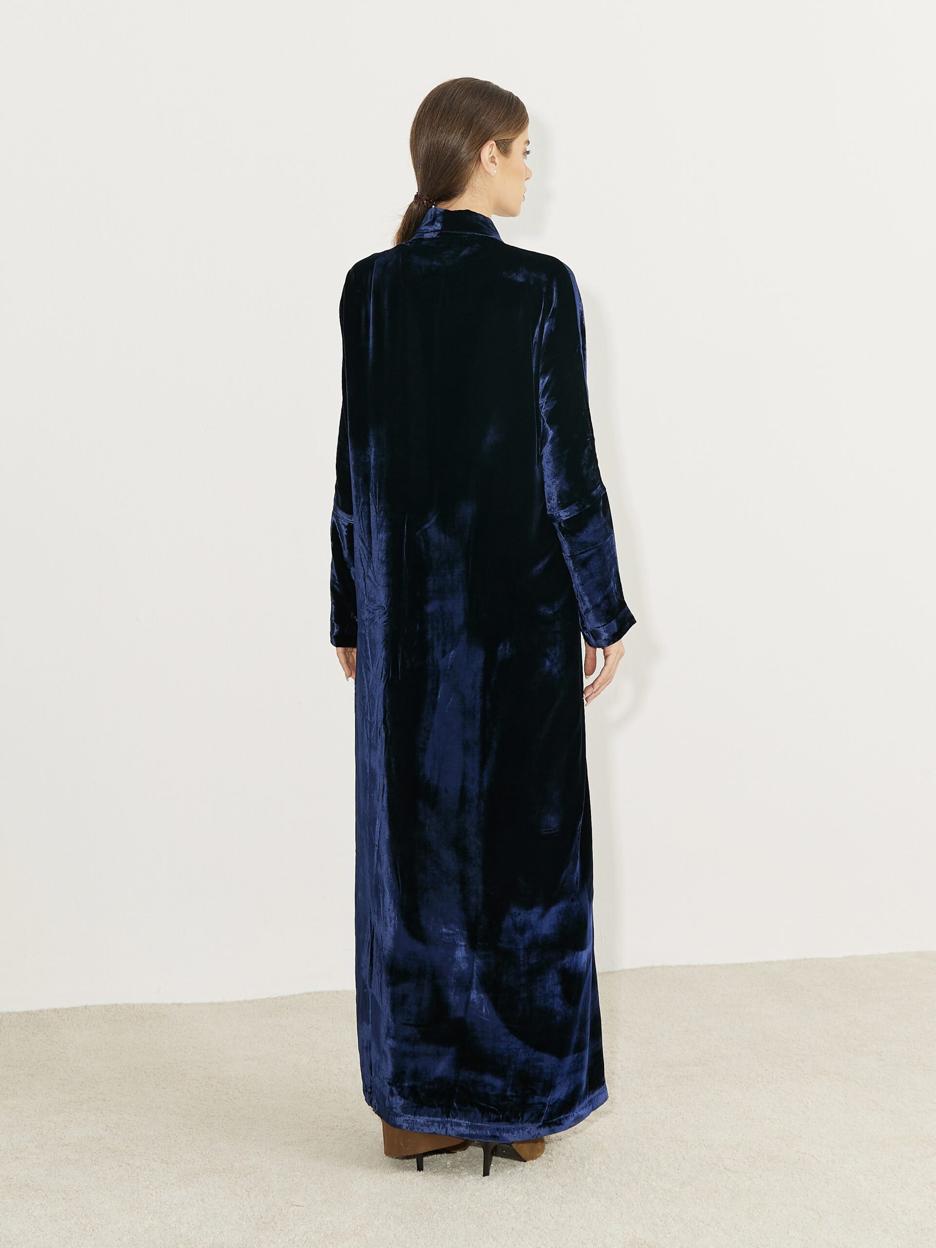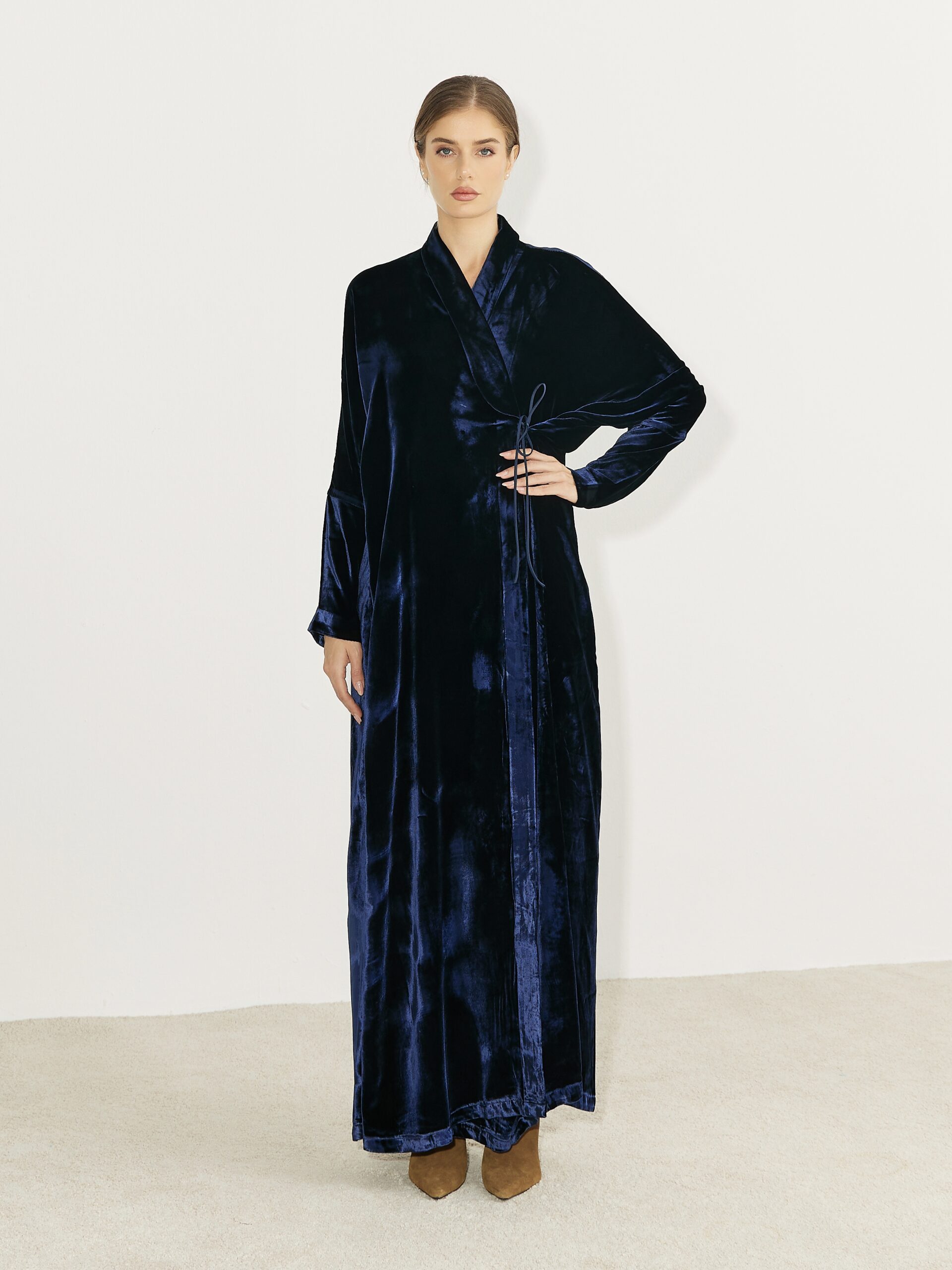 A refined velvet abaya featuring a graceful wrap design and flowing silhouette. Soft, elegant, and timeless, perfect for an understated luxury day or night.