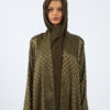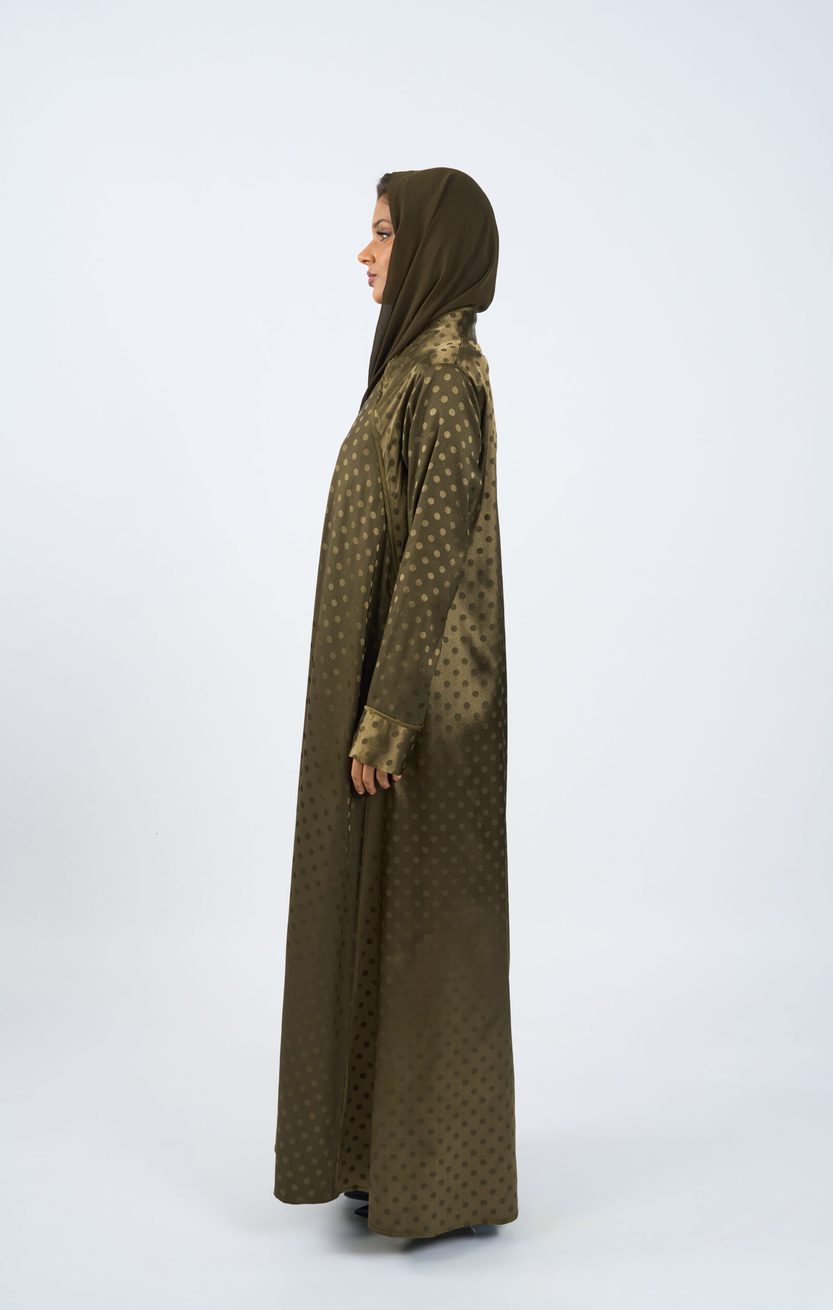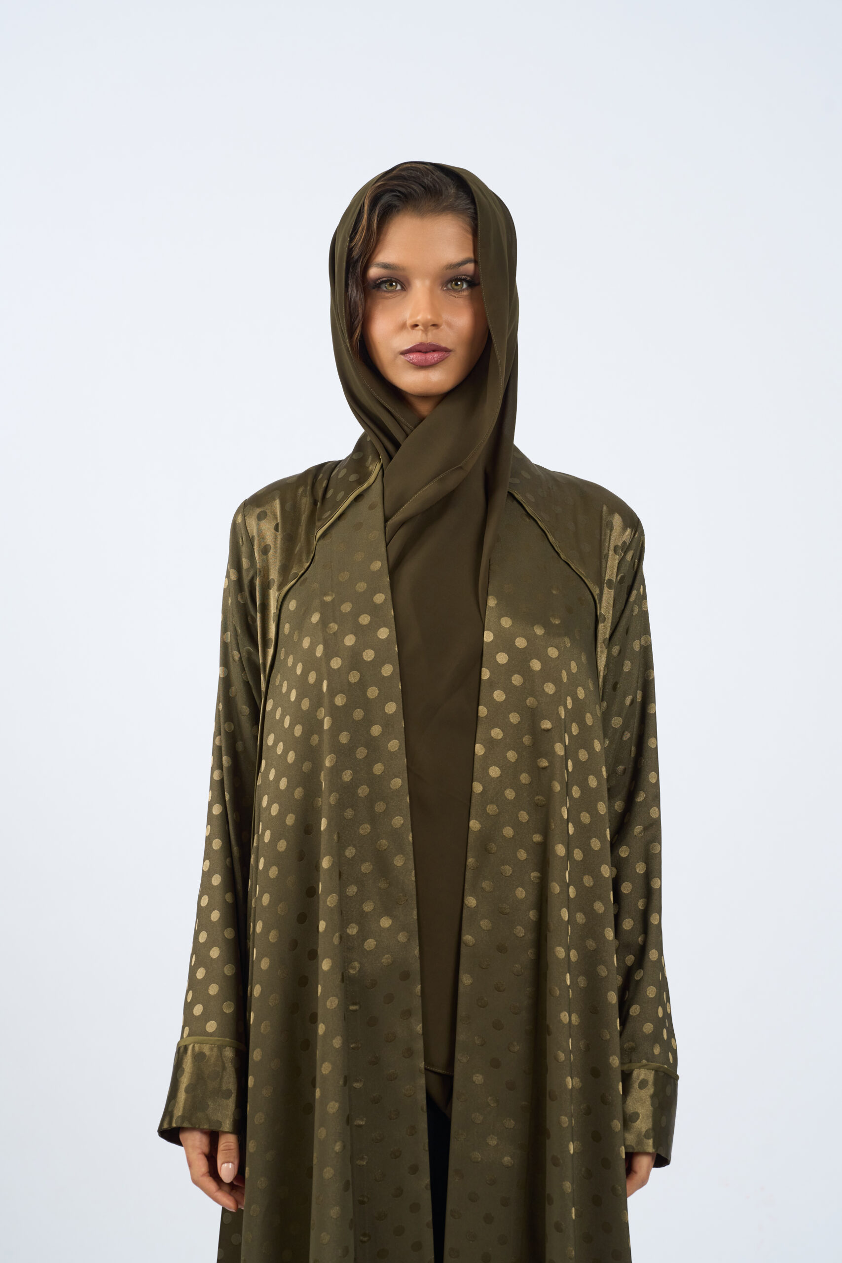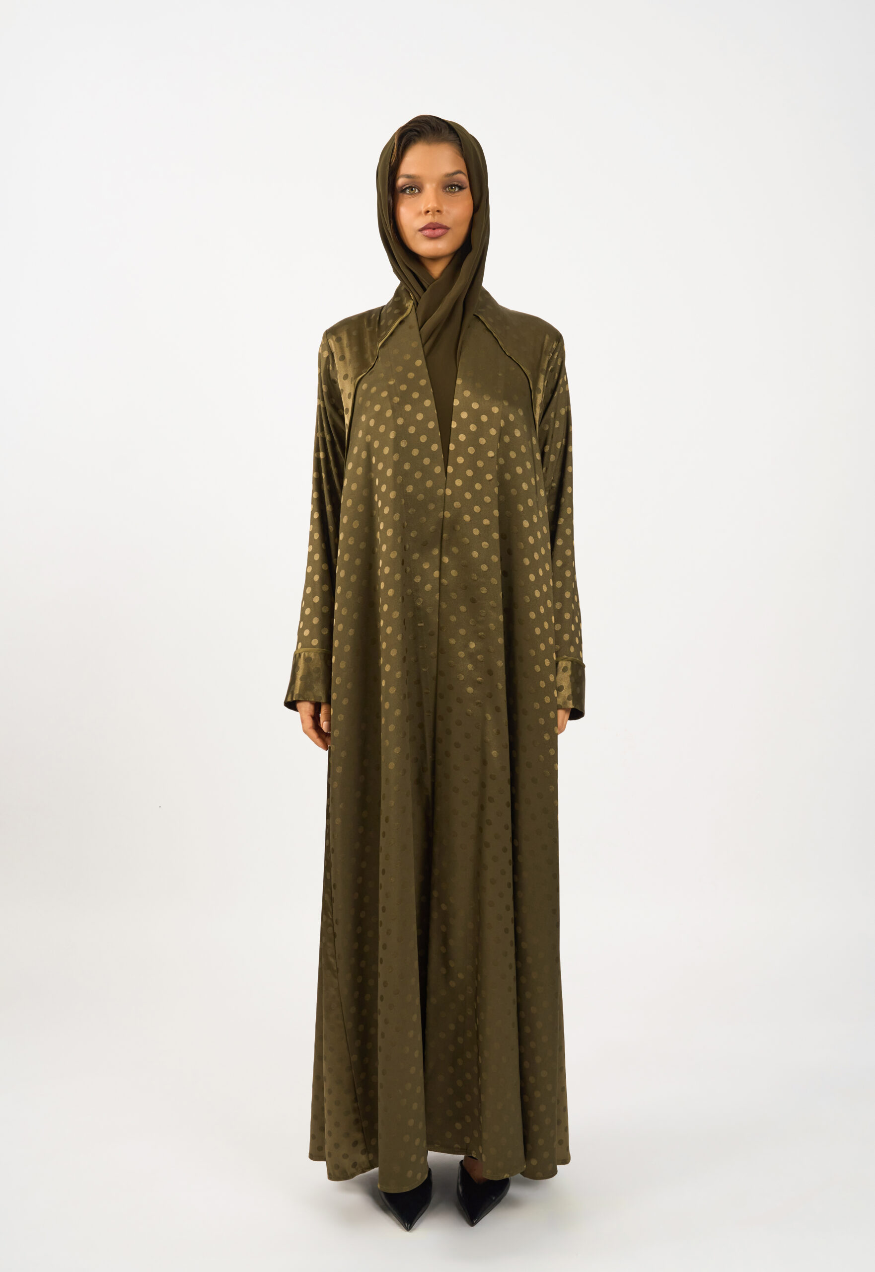 An elegant open abaya crafted from lustrous jacquard fabric featuring subtle polka dots. Designed with a relaxed, flowing silhouette and structured cuffs, this piece drapes beautifully for a refined and graceful look.