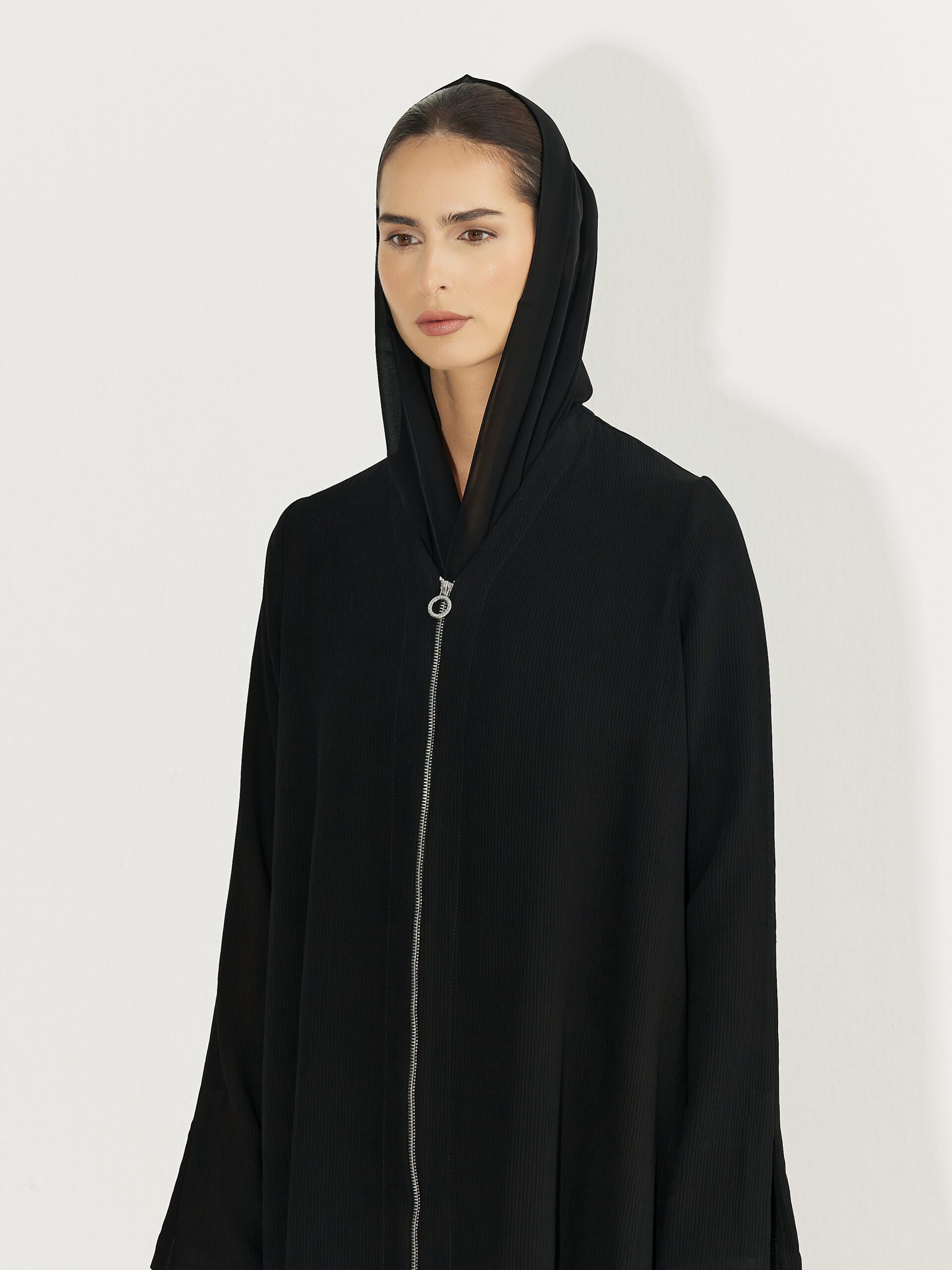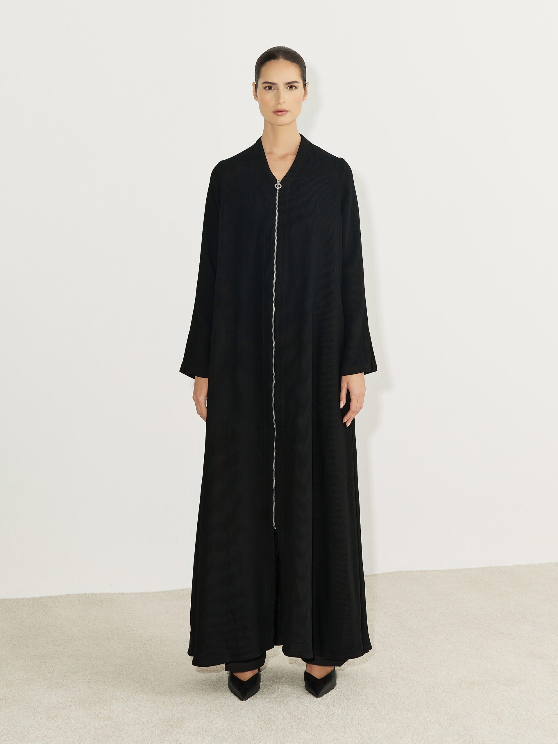 A contemporary abaya designed with a front zipper and shirt detail for effortless styling. Featuring a relaxed silhouette and clean lines. It offers modern elegance with everyday comfort, perfect for refined, versatile wear.