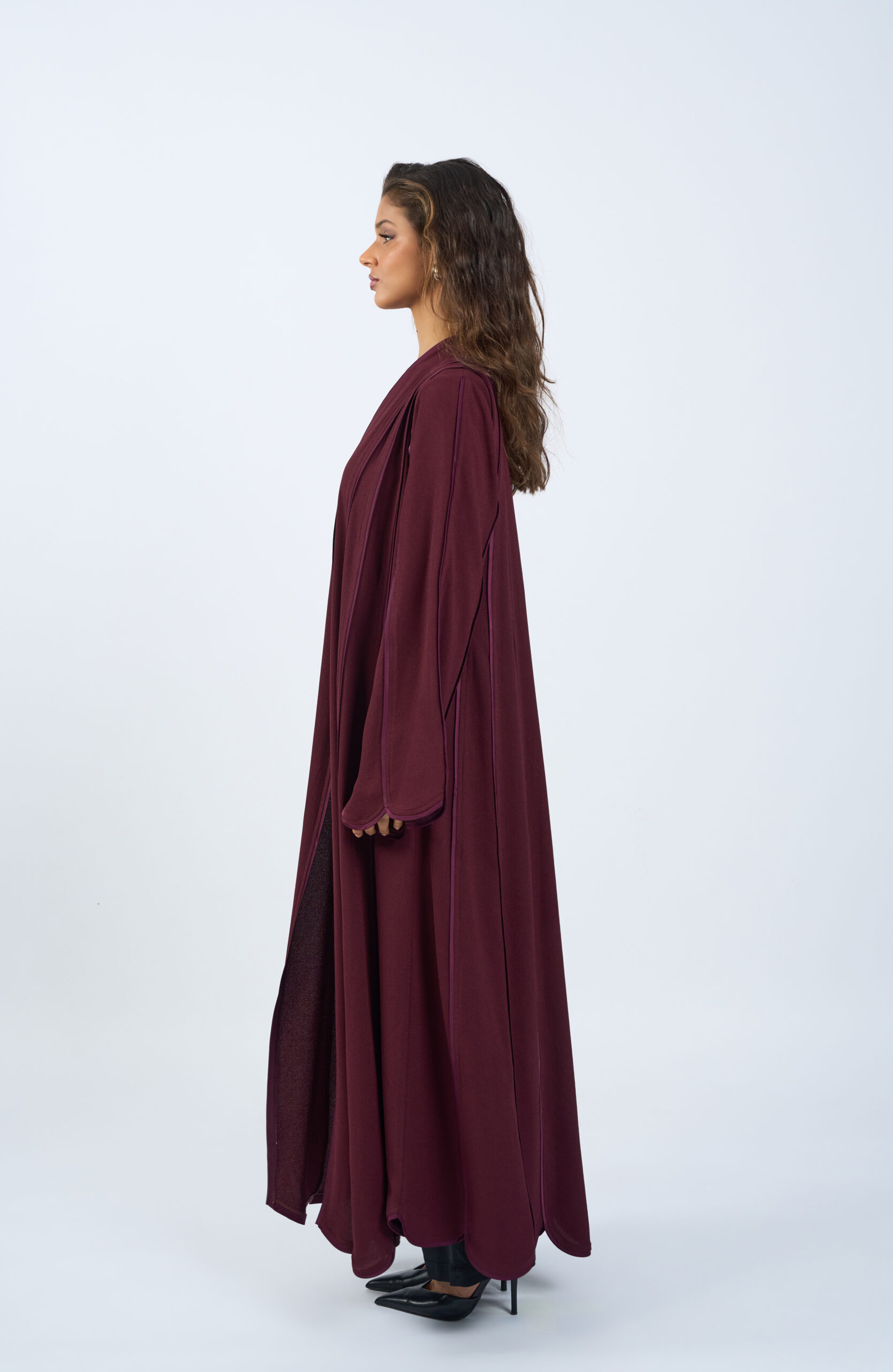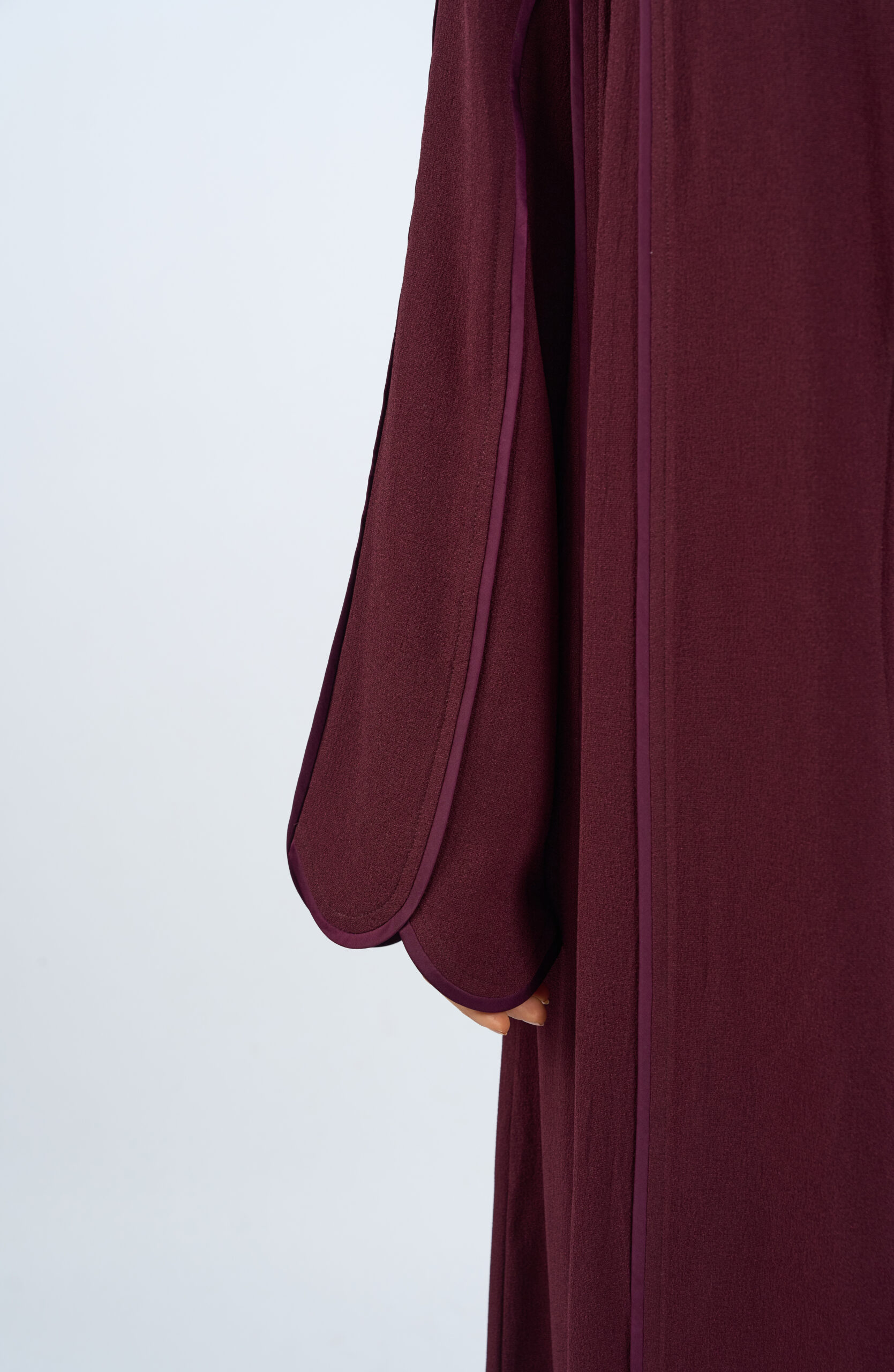 A refined open abaya designed in our signature cut, defined by its clean vertical lines and effortlessly flowing silhouette. Crafted from lightweight, fluid fabric, it drapes beautifully to create an elongated and graceful look.