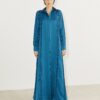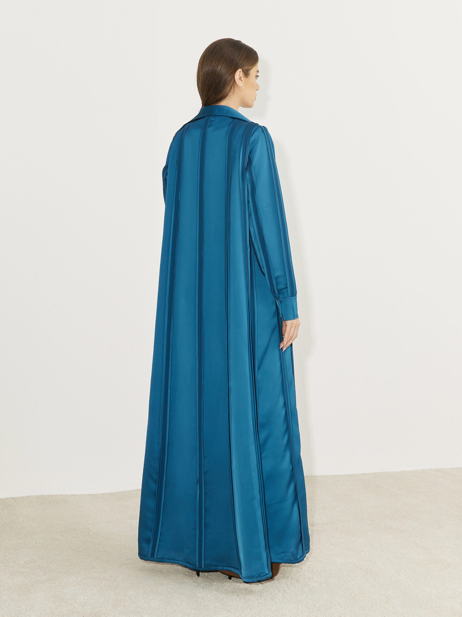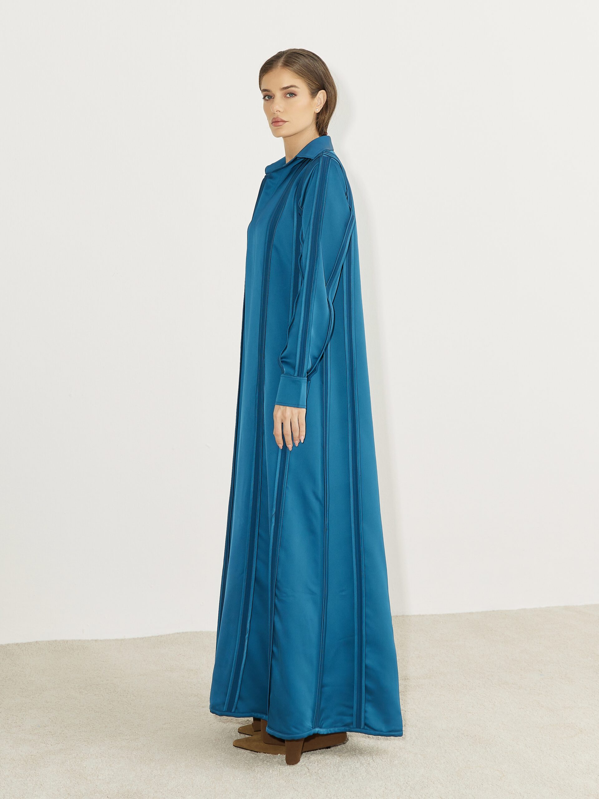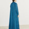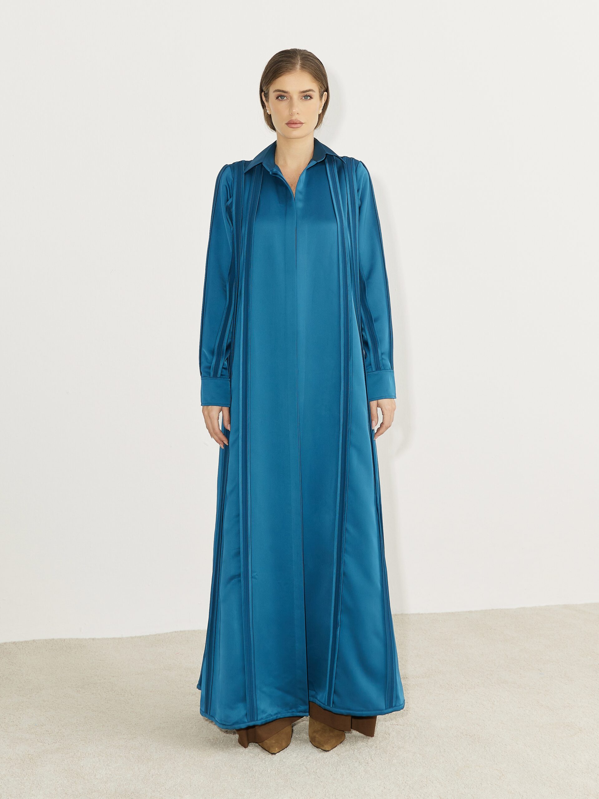 A refined abaya crafted with an elegant fluid drape and sculpted panel detailing that moves effortlessly with the body, designed with a clean front opening tailored cuffs and a graceful silhouette it embodies understated luxury and timeless sophistication for elevated day-t-evening wear.